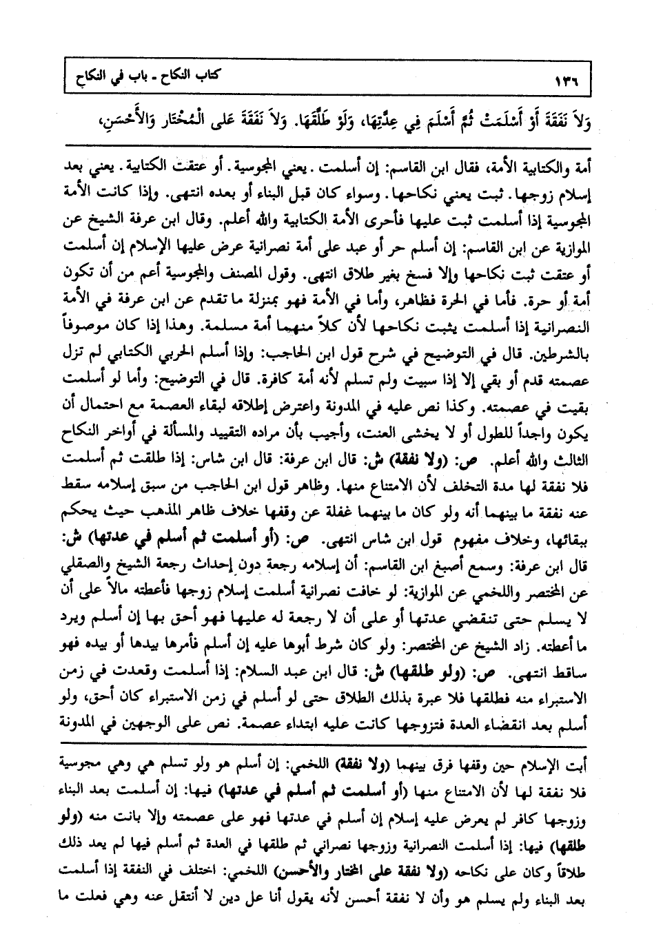 أمة والكتابية الأمة فقال ابن القاسم إن أسلمت يعني المجوسية أو عتقت الكتابية يعني بعد إسلام زوجها ثبت يعني نكاحها وسواء كان قبل البناء أو بعده انتهى. وإذا كانت الأمة المجوسية إذا أسلمت ثبت عليها فأحرى الأمة الكتابية والله أعلم. وقال ابن عرفة الشيخ عن الموازية عن ابن القاسم إن أسلم حر أو عبد على أمة نصرانية عرض عليها الإسلام إن أسلمت أو عتقت ثبت نكاحها وإلا فسخ بغير طلاق انتهى. وقول المصنف والمجوسية أعم من أن تكون أمة أو حرة فأما في الحرة فظاهر وأما في الأمة فهو بمنزلة ما تقدم عن ابن عرفة في الأمة النصرانية إذا أسلمت يثبت نكاحها لأن كلا منهما أمة مسلمة وهذا إذا كان موصوفا بالشرطين قال في التوضيح في شرح قول ابن الحاجب وإذا أسلم الحربي الكتابي لم تزل عصمته قدم أو بقي إلا إذا سبيت ولم تسلم لأنه أمة كافرة قال في التوضيح وأما لو في عصمته وكذا نص عليه في المدونة واعترض إطلاقه لبقاء العصمة مع احتمال أن يكون واجدا للطول أو لا يخشى العنت وأجيب بأن مراده التقييد والمسألة: في أواخر النكاح الثالث: والله أعلم. ص: "ولا نفقة" ش: قال ابن عرفة قال ابن شاس إذا طلقت ثم أسلمت فلا نفقة لها مدة التخلف لأن الامتناع منها وظاهر قول ابن الحاجب من سبق إسلامه سقط عنه نفقة ما بينهما أنه ولو كان ما بينهما غفلة عن وقفها خلاف ظاهر المذهب حيث يحكم ببقائها وخلاف مفهوم قول ابن شاس انتهى. ص: "أو أسلمت ثم أسلم في عدتها" ش: قال ابن عرفة وسمع أصبغ ابن القاسم أن إسلامه رجعة دون إحداث رجعة الشيخ والصقلي عن المختصر واللخمي عن الموازية لو خافت نصرانية أسلمت إسلام زوجها فأعطته مالا على أن لا يسلم حتى تنقضي عدتها أو على أن لا رجعة له عليها فهو أحق بها إن أسلم ويرد ما أعطته زاد الشيخ عن المختصر ولو كان شرط أبوها عليه إن أسلم فأمرها بيدها أو بيده فهو ساقط انتهى. ص: "ولو طلقها" ش: قال ابن عبد السلام إذا أسلمت وقعدت في زمن الاستبراء منه فطلقها فلا عبرة بذلك الطلاق حتى لو أسلم في زمن الاستبراء كان أحق ولو أسلم بعد انقضاء العدة فتزوجها كانت عليه ابتداء عصمة نص على الوجهين في المدونة