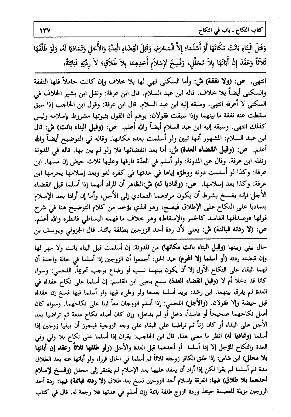انتهى ص: "ولا نفقة" ش: وأما السكنى فهي لها بلا خلاف وإن كانت حاملا فلها النفقة والسكنى أيضا بلا خلاف قاله ابن عبد السلام قال ابن عرفة ونقل ابن بشير الخلاف في السكنى لا أعرفه انتهى. وسبقه إليه ابن عبد السلام قال ابن عرفة وقول ابن الحاجب إذا سبق سقطت عنه نفقة ما بينهما وإذا سبقت فقولان يوهم أن القول بثبوتها مشروط بإسلامه وليس كذلك انتهى. وسبقه إليه ابن عبد السلام أيضا والله أعلم. ص: "وقبل البناء بانت" ش: قال ابن عبد السلام المشهور أنها تبين ولو أسلمت بعده مكانها وقاله في التوضيح أيضا والله أعلم. ص: "وقبل انقضاء العدة" ش: أما بعد انقضائها فلا ولو لم يبن بها قاله في المدونة ونقله ابن عرفة وقال عن المدونة ولو أسلم في العدة فارقها وعليها ثلاث حيض إن مسها ابن عرفة وكذا لو أسلمت دونه ووطؤه إياها في عدتها في كفره لغو وبعد إسلامها يحرمها ابن عرفة وكذا بعد إسلامها ص: "وتماديا له" ش: الظاهر أن المراد أنهما إذا أسلما قبل انقضاء الأجل فإنه يفسخ بشرط أن يكون مرادهما التمادي إلى الأجل وأما إن أرادا بعد الإسلام يتماديا على النكاح على الإطلاق فيصح وهو الذي يؤخذ من كلام التوضيح هنا في شرح قولها"وصداقها الفاسد كالخمر والإسقاط" وهو خلاف ما فهمه البساطي فانظره والله أعلم. ص: "لا ردته فبائنة" ش: يعني لأن ردة أحد الزوجين بطلقة بائنة قال الجزولي ويوسف بن