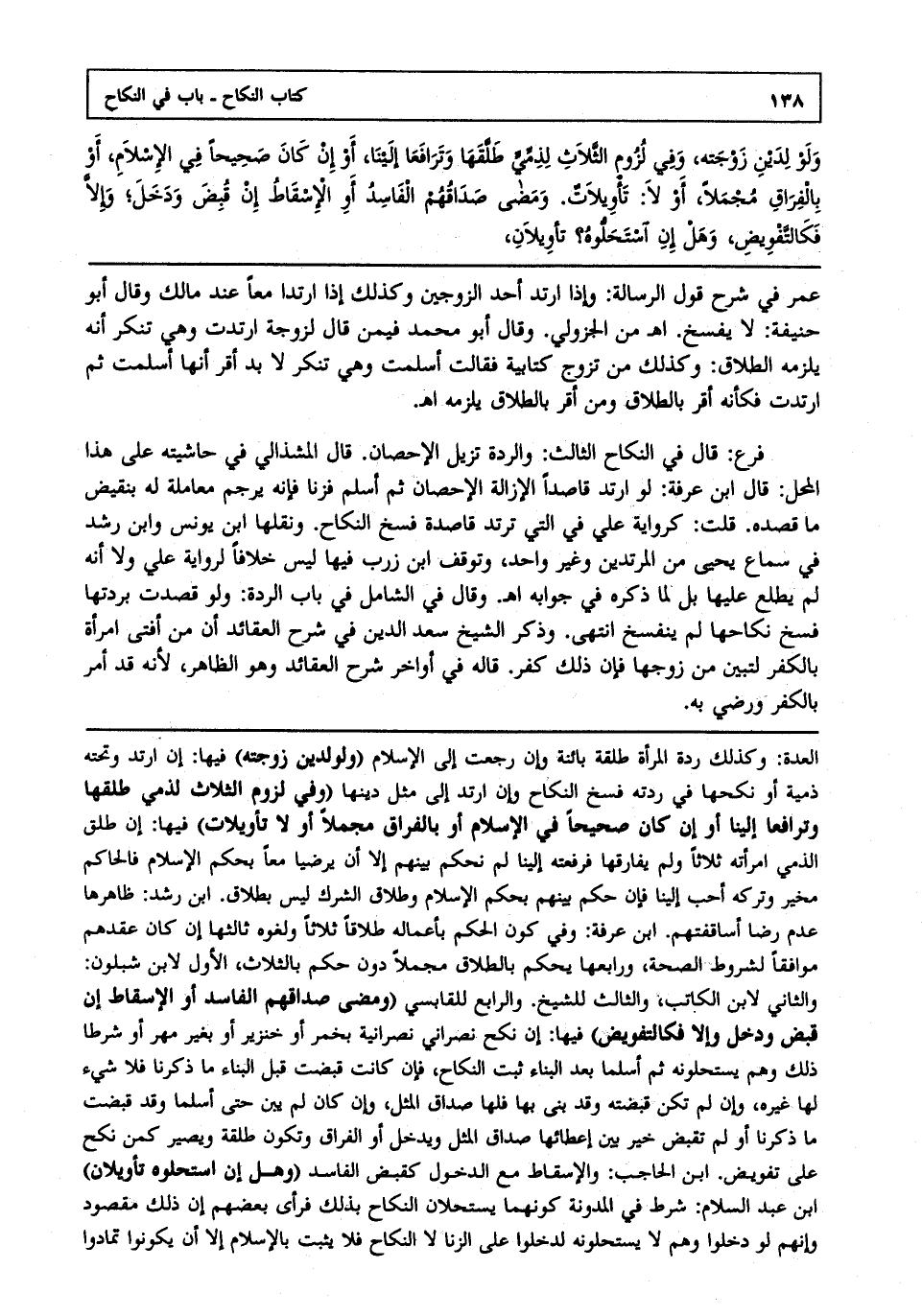 عمر في شرح قول الرسالة وإذا ارتد أحد الزوجين وكذلك إذا ارتدا معا عند مالك وقال أبو حنيفة لا يفسخ انتهى. من الجزولي وقال أبو محمد فيمن قال لزوجة ارتدت وهي تنكر أنه يلزمه الطلاق وكذلك من تزوج كتابية فقالت أسلمت وهي تنكر لا بد أقر أنها أسلمت ثم ارتدت فكأنه أقر بالطلاق ومن أقر بالطلاق يلزمه انتهى.