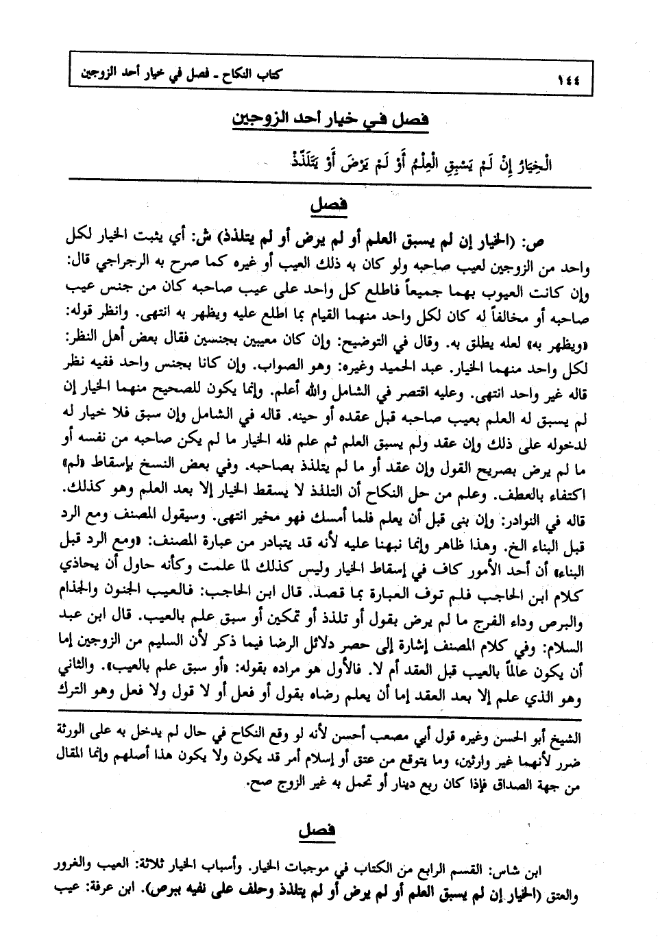 ص:"في الخيار إن لم يسبق العلم أو لم يرض أو لم يتلذذ" ش: أي يثبت الخيار لكل واحد من الزوجين لعيب صاحبه ولو كان به ذلك العيب أو غيره كما صرح به الرجراجي قال وإن كانت العيوب بهما جميعا فاطلع كل واحد على عيب صاحبه كان من جنس عيب صاحبه أو مخالفا له كان لكل واحد منهما القيام بما اطلع عليه ويظهر به انتهى. وانظر قوله ويظهر به لعله يطلق به وقال في التوضيح وإن كان معيبين بجنسين فقال بعض أهل النظر لكل واحد منهما الخيار عبد الحميد وغيره وهو الصواب وإن كانا بجنس واحد ففيه نظر قاله غير واحد انتهى. وعليه اقتصر في الشامل والله أعلم. وإنما يكون للصحيح منهما الخيار إن لم يسبق له العلم بعيب صاحبه قبل عقده أو حينه قاله في الشامل وإن سبق فلا خيار له لدخوله على ذلك وإن عقد ولم يسبق العلم ثم علم فله الخيار ما لم يكن صاحبه من نفسه أو ما لم يرض بصريح القول وإن عقد أو ما لم يتلذذ بصاحبه وفي بعض النسخ بإسقاط لم اكتفاء بالعطف وعلم من حل النكاح أن التلذذ لا يسقط الخيار إلا بعد العلم وهو كذلك قاله في النوادر وإن بنى قبل أن يعلم فلما أمسك فهو مخير انتهى. وسيقول المصنف ومع الرد قبل البناء الخ وهذا ظاهر وإنما نبهنا عليه لأنه قد يتبادر من عبارة المصنف "ومع الرد قبل البناء" أن أحد الأمور كاف في إسقاط الخيار وليس كذلك لما علمت وكأنه حاول أن يحاذي كلام ابن الحاجب فلم توف العبارة بما قصد قال ابن الحاجب فالعيب الجنون والجذام والبرص وداء الفرج ما لم يرض بقول أو تلذذ أو تمكين أو سبق علم بالعيب قال ابن عبد السلام وفي كلام المصنف إشارة إلى حصر دلائل الرضا فيما ذكر لأن السليم من الزوجين إما أن يكون عالما بالعيب قبل العقد أم لا فالأول: هو مراده بقوله"أو سبق علم بالعيب" والثاني وهو الذي علم إلا بعد العقد إما أن يعلم رضاه بقول أو فعل أو لا قول ولا فعل وهو الترك
