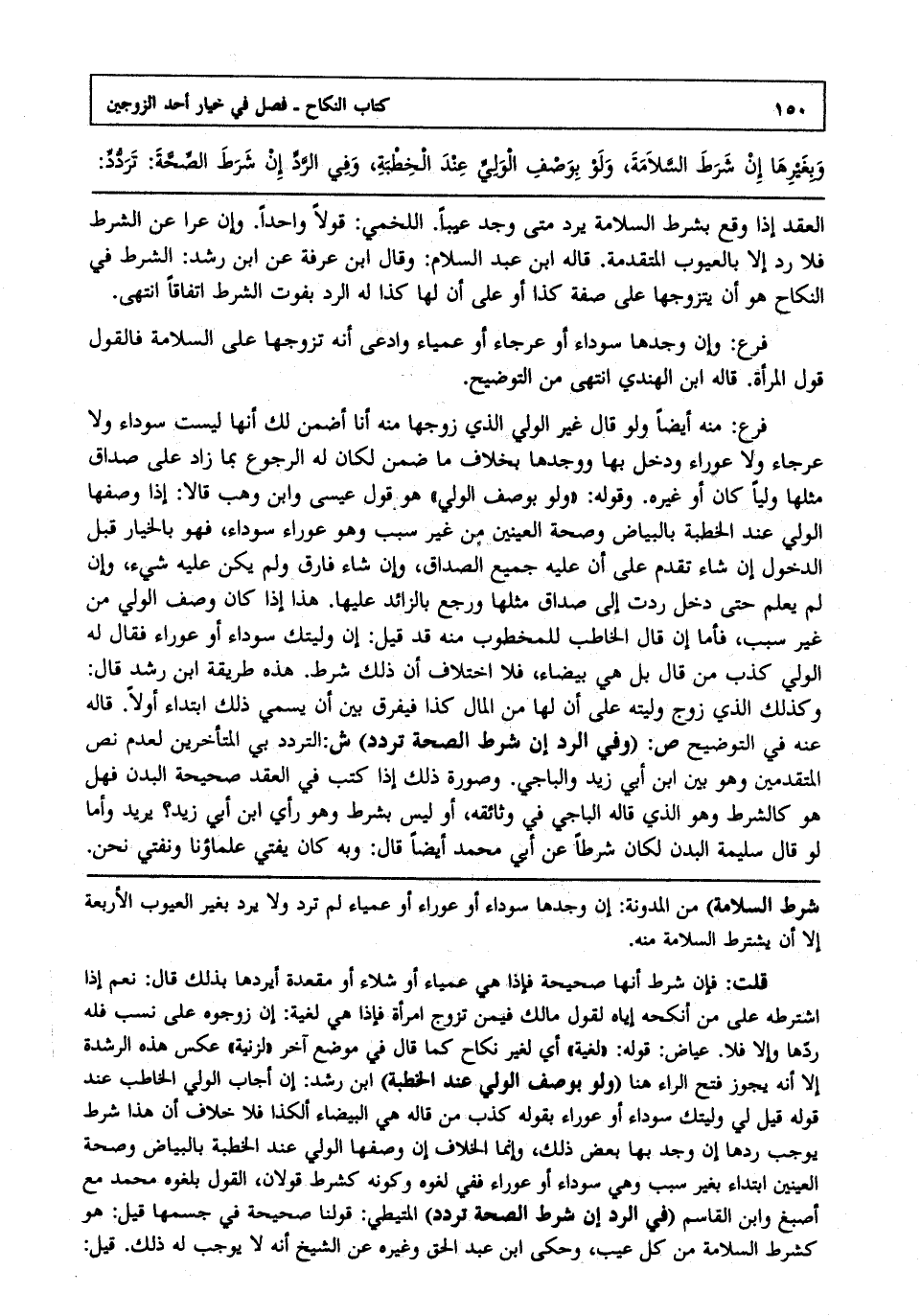 العقد إذا وقع بشرط السلامة يرد متى وجد عيبا اللخمي قولا واحدا وإن عرا عن الشرط فلا رد إلا بالعيوب المتقدمة قاله ابن عبد السلام وقال ابن عرفة عن ابن رشد الشرط في النكاح هو أن يتزوجها على صفة كذا أو على أن لها كذا له الرد بفوت الشرط اتفاقا انتهى.
