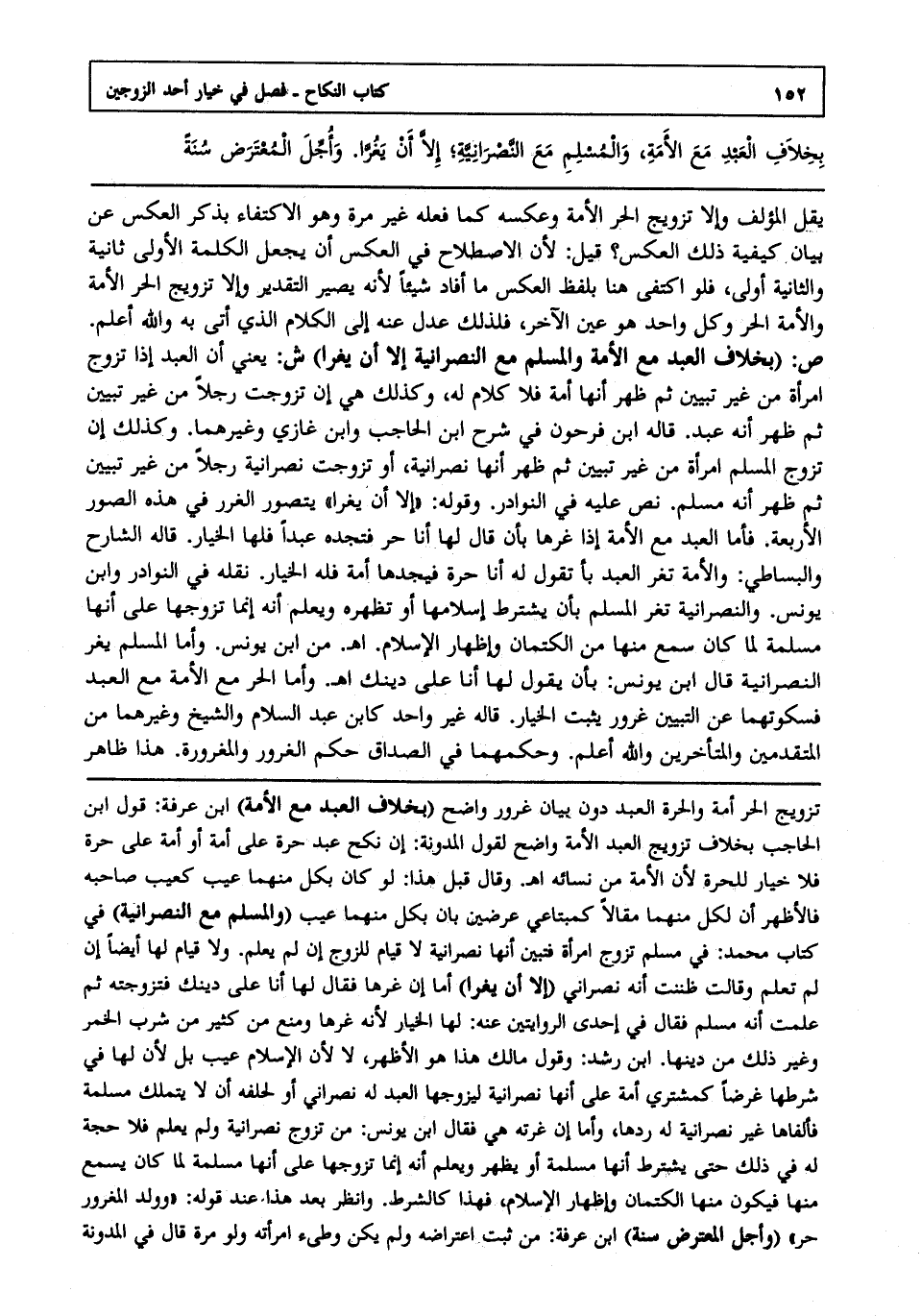 يقل المؤلف وإلا تزويج الحر الأمة وعكسه كما فعله غير مرة وهو الاكتفاء بذكر العكس عن بيان كيفية ذلك العكس؟ قيل: لأن الاصطلاح في العكس أن يجعل الكلمة الأولى ثانية والثانية أولى فلو اكتفى هنا بلفظ العكس ما أفاد شيئا لأنه يصير التقدير وإلا تزويج الحر الأمة والأمة الحر وكل واحد هو عين الآخر فلذلك عدل عنه إلى الكلام الذي أتى به والله أعلم. ص: "بخلاف العبد مع الأمة والمسلم مع النصرانية إلا أن يغرا" ش: يعني أن العبد إذا تزوج امرأة من غير تبيين ثم ظهر أنها أمة فلا كلام له وكذلك هي إن تزوجت رجلا من غير تبيين ثم ظهر أنه عبد قاله ابن فرحون في شرح ابن الحاجب وابن غازي وغيرهما وكذلك إن تزوج المسلم امرأة من غير تبيين ثم ظهر أنها نصرانية أو تزوجت نصرانية رجلا من غير تبيين ثم ظهر أنه مسلم نص عليه في النوادر وقوله"إلا أن يغرا" يتصور الغرر في هذه الصور الأربعة فأما العبد مع الأمة إذا غرها بأن قال لها أنا حر فتجده عبدا فلها الخيار قاله الشارح والبساطي والأمة تغر العبد بأن تقول له أنا حرة فيجدها أمة فله الخيار نقله في النوادر وابن يونس والنصرانية تغر المسلم بأن يشترط إسلامها أو تظهره ويعلم أنه إنما تزوجها على أنها مسلمة لما كان سمع منها من الكتمان وإظهار الإسلام انتهى. من ابن يونس وأما المسلم يغر النصرانية قال ابن يونس بأن يقول لها أنا على دينك انتهى. وأما الحر مع الأمة مع العبد فسكوتهما عن التبيين غرور يثبت الخيار قاله غير واحد كابن عبد السلام والشيخ وغيرهما من المتقدمين والمتأخرين والله أعلم. وحكمهما في الصداق حكم الغرور والمغرورة هذا ظاهر