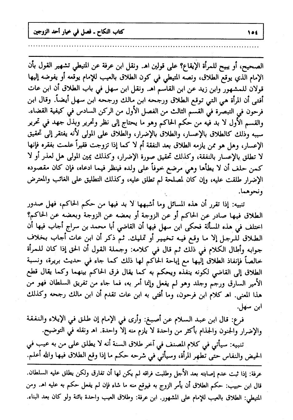 تنبيه: إذا تقرر أن هذه المسائل وما أشبهها لا بد فيها من حكم الحاكم فهل صدور الطلاق فيها صادر عن الحاكم أو عن الزوجة أو بعضه عن الزوجة وبعضه عن الحاكم اختلف في هذه المسألة: فحكى ابن سهل فيها أن القاضي أبا محمد بن سراج أجاب فيها أن الطلاق للرجل إلا ما وقع فيه تخيير أو تمليك ثم ذكر أن ابن عات أجاب بخلاف جوابه وأطال الكلام في ذلك ثم قال في كلامه وجملة القول أن الحق إذا كان للمرأة خالصا فإنفاذ الطلاق إليها مع إباحة الحاكم لها ذلك كما جاء في حديث بريرة ونسبة الطلاق إلى القاضي لكونه ينفذه ويحكم به كما يقال فرق الحاكم بينهما وكما يقال قطع الأمير السارق ورجم وجلد وهو لم يفعل وإنما أمر به فما جاء من تفريق السلطان فهو من هذا المعنى انتهى. كلام ابن فرحون وما أفتى به ابن عات تقدم أن ابن مالك رجحه وكذلك ابن سهل.