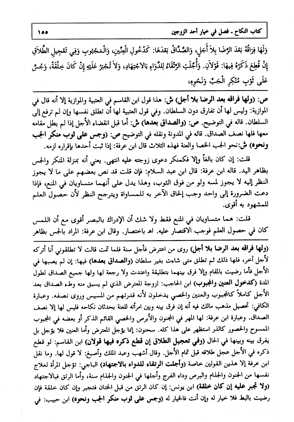 ص:"ولها فراقه بعد الرضا بلا أجل" ش: هذا قول ابن القاسم في العتبية والموازية إلا أنه قال في الموازية: وليس لها أن تفارق دون السلطان وفي قول العتبية لها أن تطلق نفسها وإن لم ترفع إلى السلطان قاله في التوضيح ص: "والصداق بعدها" ش: أما قبل انقضاء الأجل إذا لم يطل مقامه معها فلها نصف الصداق قاله في المدونة ونقله في التوضيح ص: "وجس على ثوب منكر الجب ونحوه" ش: نحو الجب الخصا والعنة فهذه الثلاث قال ابن عرفة إذا ثبت أحدها بإقراره لزمه.