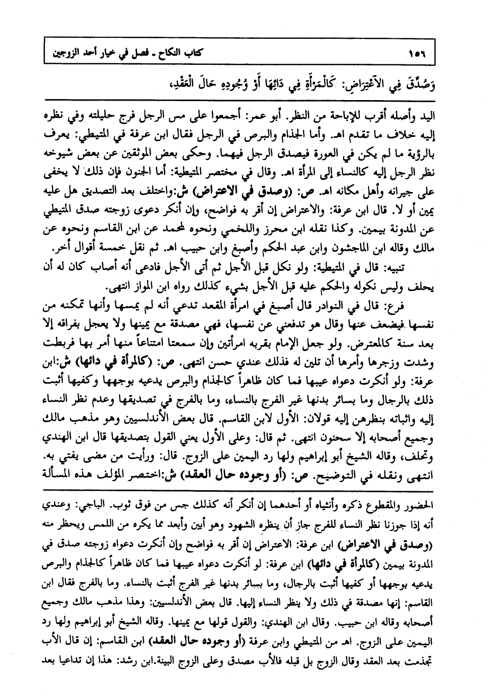 اليد وأصله أقرب للإباحة من النظر.أبو عمر أجمعوا على مس الرجل فرج حليلته وفي نظره إليه خلاف ما تقدم انتهى. وأما الجذام والبرص في الرجل فقال ابن عرفة في المتيطي يعرف بالرؤية ما لم يكن في العورة فيصدق الرجل فيهما وحكى بعض الموثقين عن بعض شيوخه نظر الرجل إليه كالنساء إلى المرأة انتهى. وقال في مختصر المتيطية أما الجنون فإن ذلك لا يخفى على جيرانه وأهل مكانه انتهى. ص: "وصدق في الاعتراض" ش: واختلف بعد التصديق هل عليه يمين أو لا قال ابن عرفة والاعتراض إن أقر به فواضح وإن أنكر دعوى زوجته صدق المتيطي عن المدونة بيمين وكذا نقله ابن محرز واللخمي ونحوه لمحمد عن ابن القاسم ونحوه عن مالك وقاله ابن الماجشون وابن عبد الحكم وأصبغ وابن حبيب انتهى. ثم نقل خمسة أقوال أخر.