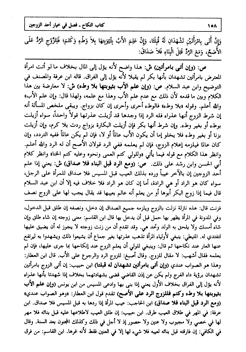 ص:"وإن أتى بامرأتين" ش: هذا واضح لأنه يؤول إلى المال بخلاف ما لو أتت امرأة المعترض بامرأتين تشهدان بأنها بكر لم يقبلا لأنه يؤول إلى الفراق قاله ابن عرفة والمصنف في التوضيح وابن عبد السلام ص: "وإن علم الأب بثيوبتها بلا وطء" ش: لا معارضة بين هذا الكلام وبين ما قدمه لأن ذلك مع عدم علم الأب وهذا مع علمه ولهذا قال:"وإن علم الأب" والله أعلم. وقوله بلا وطء فالوطء أحرى وأحرى إن كان بزواج ويبقى ملخص المسألة: أنه إن شرط الزوج أنها عذراء فله الرد إذا وجدها قد أزيلت عذرتها قولا واحدا سواء أزيلت بوطء أو بغير وطء وإن شرط أنها بكر فإن أزيلت البكارة بزواج ردت بلا كرم وإن أزيلت بزنا أو بغير وطء فلا يخلو إما أن يكون الأب عالما أو لا فإن لم يكن عالما ففيه التردد وإن كان عالما فيلزمه إعلام الزوج فإن لم يعلمه ففي الرد قولان الأصح أن له الرد والله أعلم. وانظر هذا الكلام مع قوله فيما يأتي"وللولي كتم العمى ونحوه وعليه كتم الخنا" وانظر كلام أبي الحسن وابن رشد على ذلك ص: "ومع الرد قبل البناء فلا صداق" ش: يعني إذا علم أحد الزوجين إن بالآخر عيبا ورده بذلك العيب قبل المسيس فلا صداق للمرأة على الرجل سواء كان هو الراد أو هي الرادة أما إن كان هو الراد فلا خلاف فيه إلا أن ابن عبد السلام قال فيما إذا زوج البكر أبوها أو من يعلم أنه عالم بعيبها قد يقال يجب لها على الزوج نصف