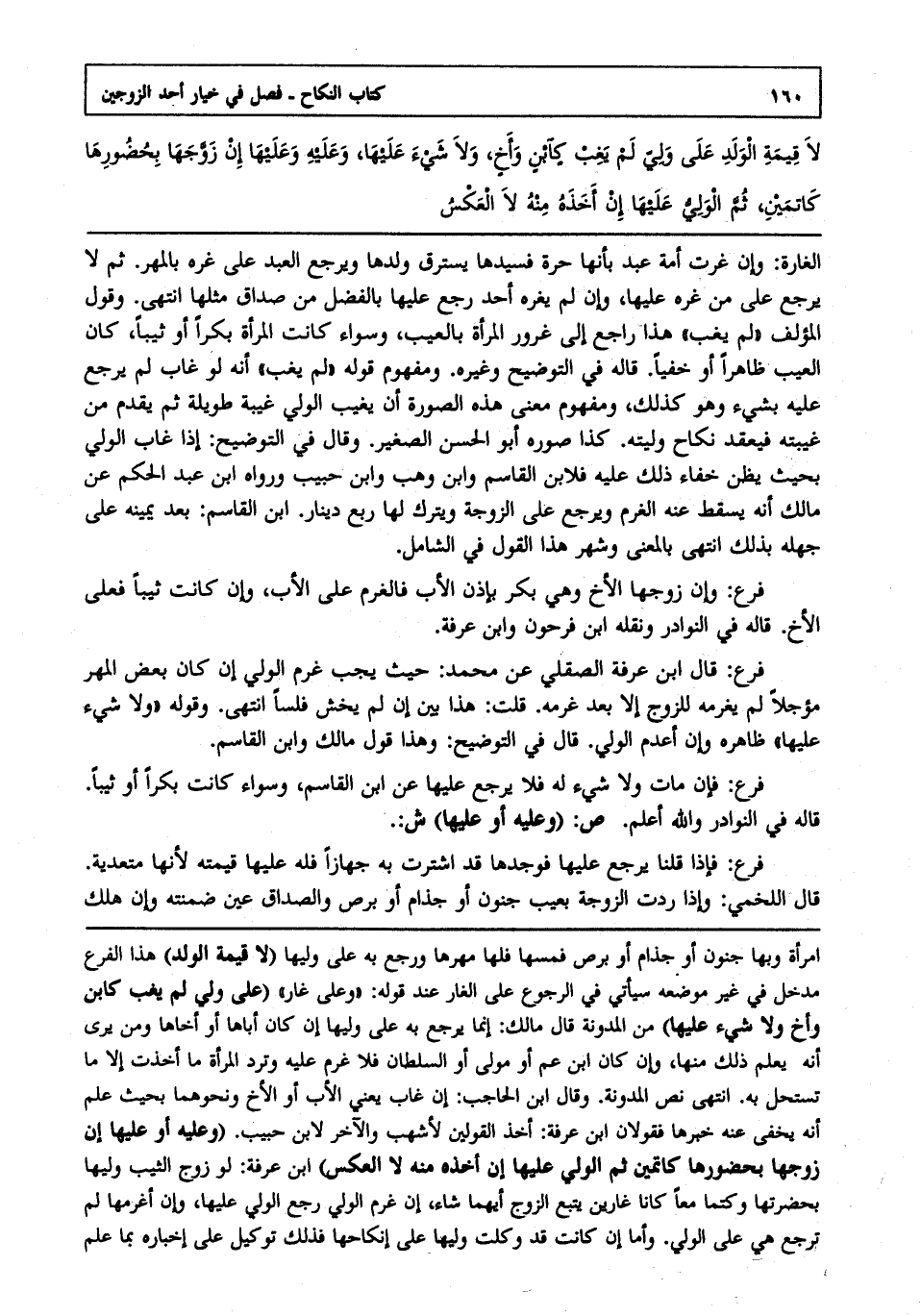 الغارة: وإن غرت أمة عبد بأنها حرة فسيدها يسترق ولدها ويرجع العبد على غره بالمهر ثم لا يرجع على من غره عليها وإن لم يغره أحد رجع عليها بالفضل من صداق مثلها انتهى. وقول المؤلف "لم يغب" هذا راجع إلى غرور المرأة بالعيب وسواء كانت المرأة بكرا أو ثيبا كان العيب ظاهرا أو خفيا قاله في التوضيح وغيره ومفهوم قوله"لم يغب" أنه لو غاب لم يرجع عليه بشيء وهو كذلك ومفهوم معنى هذه الصورة أن يغيب الولي غيبة طويلة ثم يقدم من غيبته فيعقد نكاح وليته كذا صوره أبو الحسن الصغير وقال في التوضيح إذا غاب الولي بحيث يظن خفاء ذلك عليه فلابن القاسم وابن وهب وابن حبيب ورواه ابن عبد الحكم عن مالك أنه يسقط عنه الغرم ويرجع على الزوجة ويترك لها ربع دينار ابن القاسم بعد يمينه على جهله بذلك انتهى. بالمعنى وشهر هذا القول في الشامل.