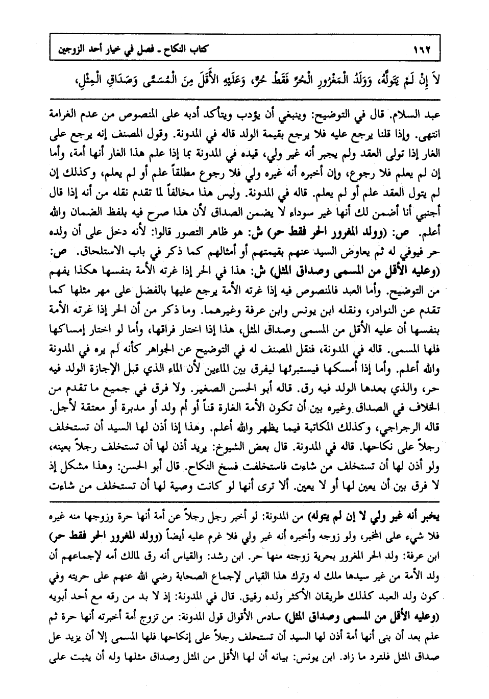 عبد السلام قال في التوضيح وينبغي أن يؤدب ويتأكد أدبه على المنصوص من عدم الغرامة انتهى. وإذا قلنا يرجع عليه فلا يرجع بقيمة الولد قاله في المدونة وقول المصنف إنه يرجع على الغار إذا تولى العقد ولم يجبر أنه غير ولي قيده في المدونة بما إذا علم هذا الغار أنها أمة وأما إن لم يعلم فلا رجوع وإن أخبره أنه غيره ولي فلا رجوع مطلقا علم أو لم يعلم وكذلك إن لم يتول العقد علم أو لم يعلم قاله في المدونة وليس هذا مخالفا لما تقدم نقله من أنه إذا قال أجنبي أنا أضمن لك أنها غير سوداء لا يضمن الصداق لأن هذا صرح فيه بلفظ الضمان والله أعلم. ص: "وولد المغرور الحر فقط حر" ش: هو ظاهر التصور قالوا لأنه دخل على أن ولده حر فيوفي له ثم يعاوض السيد عنهم بقيمتهم أو أمثالهم كما ذكر في باب الاستلحاق ص: "وعليه الأقل من المسمى وصداق المثل" ش: هذا في الحر إذا غرته الأمة بنفسها هكذا يفهم من التوضيح وأما العبد فالمنصوص فيه إذا غرته الأمة يرجع عليها بالفضل على مهر مثلها كما تقدم عن النوادر ونقله ابن يونس وابن عرفة وغيرهما وما ذكر من أن الحر إذا غرته الأمة بنفسها أن عليه الأقل من المسمى وصداق المثل هذا إذا اختار فراقها وأما لو اختار إمساكها فلها المسمى قاله في المدونة فنقل المصنف له في التوضيح عن الجواهر كأنه لم يره في المدونة والله أعلم. وأما إذا أمسكها فيستبرئها ليفرق بين الماءين لأن الماء الذي قبل الإجازة الولد فيه حر والذي بعدها الولد فيه رق قاله أبو الحسن الصغير ولا فرق في جميع ما تقدم من الخلاف في الصداق وغيره بين أن تكون الأمة الغارة قنا أو أم ولد أو مدبرة أو معتقة لأجل قاله الرجراجي وكذلك المكاتبة فيما يظهر والله أعلم. وهذا إذا أذن لها السيد أن تستخلف رجلا على نكاحها قاله في المدونة قال بعض الشيوخ يريد أذن لها أن تستخلف رجلا بعينه ولو أذن لها أن تستخلف من شاءت فاستخلفت فسخ النكاح قال أبو الحسن وهذا مشكل إذ لا فرق بين أن يعين لها أو لا يعين ألا ترى أنها لو كانت وصية لها أن تستخلف من شاءت