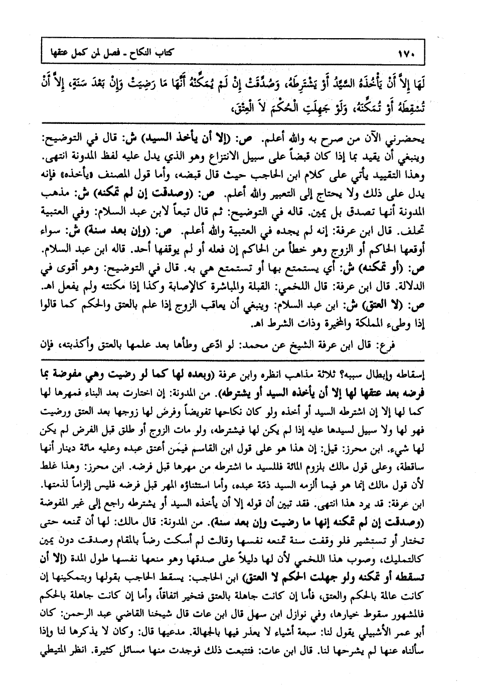 يحضرني الآن من صرح به والله أعلم. ص: "إلا أن يأخذ السيد" ش: قال في التوضيح وينبغي أن يقيد بما إذا كان قبضا على سبيل الانتزاع وهو الذي يدل عليه لفظ المدونة انتهى. وهذا التقييد يأتي على كلام ابن الحاجب حيث قال قبضه وأما قول المصنف "يأخذه" فإنه يدل على ذلك ولا يحتاج والله أعلم. ص: "وصدقت إن لم تمكنه" ش: مذهب المدونة أنها تصدق بل يمين قاله في التوضيح ثم قال تبعا لابن عبد السلام وفي العتبية تحلف قال ابن عرفة إنه لم يجده في العتبية والله أعلم. ص: "وإن بعد سنة" ش: سواء أوقعها الحاكم أو الزوج وهو خطأ من الحاكم إن فعله أو لم يوقفها أحد قاله ابن عبد السلام ص: "أو تمكنه" ش: أي يستمتع بها أو تستمتع هي به قال في التوضيح وهو أقوى في الدلالة قال ابن عرفة قال اللخمي القبلة والمباشرة كالإصابة وكذا إذا مكنته ولم يفعل انتهى. ص: "لا العتق" ش: ابن عبد السلام وينبغي أن يعاقب الزوج إذا علم بالعتق والحكم كما قالوا إذا وطىء المملكة والمخيرة وذات الشرط انتهى.