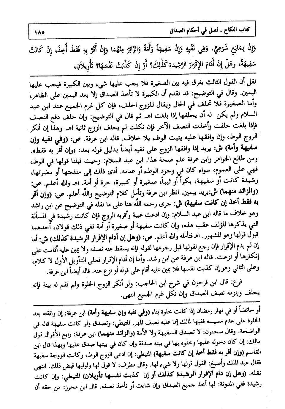 نقل أن القول الثالث: يفرق فيه بين الصغيرة فلا يجب عليها شيء وبين الكبيرة فيجب عليها اليمين وقال في التوضيح قد تقدم أن الكبيرة لا تأخذ الصداق إلا بعد اليمين على الظاهر وأما الصغيرة فلا تحلف في الحال ويقال للزوج احلف فإن كل غرم الجميع عند ابن عبد السلام ولم يكن له أن يحلفها إذا بلغت انتهى. ثم قال في التوضيح: وإن حلف دفع النصف فإذا بلغت حلفت وأخذت النصف الآخر فإن نكلت لم يحلف الزوج ثانية انتهى. وهذا إن أنكر الزوج الوطء وإن وافقها عليه يثبت الوطء بلا خلاف قاله ابن عرفة ص: "وفي نفيه وإن سفيهة وأمة" ش: يريد إذا وافقها الزوج على نفيه أيضا بدليل قوله بعد:"وإن أقر به فقط" ومن طالع الجواهر وابن عرفة علم صحة هذا ابن عبد السلام وحيث قبلنا قولها في الوطء فهي على العموم سواء كان في وجود الوطء أو عدمه أدى ذلك إلى منفعتها أو مضرتها رشيدة كانت أو سفيهة بكرا أو ثيبا صغيرة أو كبيرة حرة أو أمة انتهى. والله أعلم. ص: "والزائد منهما" ش: يريد بيمين انظر ابن عرفة وتأمل كلام التوضيح والله أعلم. ص: "وإن أقر به فقط أخذ إن كانت سفيهة" ش: جرى رحمه الله هنا على ما نقله في التوضيح عن ابن راشد وهو خلاف ما قاله ابن عبد السلام وإن ادعت عيبة وأقربه الزوج فإن كانت رشيدة في المسألة: التي يذكرها المؤلف عقب هذه وإن كانت سفيهة أو صغيرة أو أمة ففي ذلك قولان أحدهما قولها وهو المشهور انتهى. فتأمله والله أعلم. ص: "وهل أن أدام الإقرار الرشيدة كذلك" ش: أما إن لم يدم الإقرار فإن رجع لقولها قبل رجوعها لقوله فإنه يسقط عنه نصفه ولا يمين عليه أقامت على إنكارها أو نزعت قاله ابن عرفة عن ابن رشد الزوج فيوأما إن أدام الإقرار فعلى التأويل الأول لا كلام وعلى الثاني وهو إن كذبت نفسها فلا يمين عليه أقام على قوله أو نزع عنه. قاله أيضا ابن عرفة.