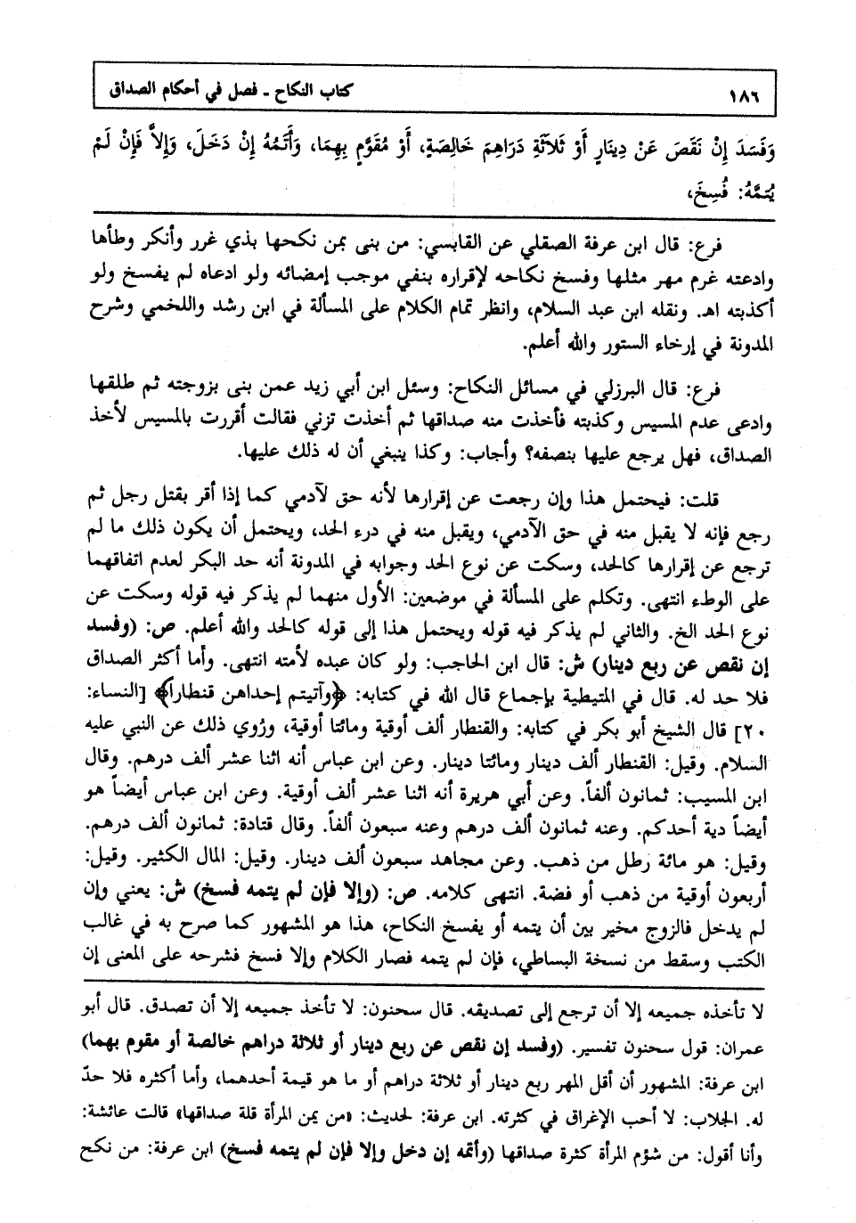 قلت: فيحتمل هذا وإن رجعت عن إقرارها لأنه حق لآدمي كما إذا أقر بقتل رجل ثم رجع فإنه لا يقبل منه في حق الآدمي ويقبل منه في درء الحد ويحتمل أن يكون ذلك ما لم ترجع عن إقرارها كالحد وسكت عن نوع الحد وجوابه في المدونة أنه حد البكر لعدم اتفاقهما على الوطء انتهى. وتكلم على المسألة: في موضعين: الأول منهما لم يذكر فيه قوله وسكت عن نوع الحد الخ والثاني لم يذكر فيه قوله ويحتمل هذا إلى قوله كالحد والله أعلم. ص: "وفسد إن نقص عن ربع دينار" ش: قال ابن الحاجب ولو كان عبده لأمته انتهى. وأما أكثر الصداق فلا حد له قال في المتيطية بإجماع قال الله في كتابه: {وَآتَيْتُمْ إِحْدَاهُنَّ قِنْطَاراً} قال الشيخ أبو بكر في كتابه والقنطار ألف أوقية ومائتا أوقية وروي ذلك عن النبي عليه السلام وقيل القنطار ألف دينار ومائتا دينار وعن ابن عباس أنه اثنا عشر ألف درهم وقال ابن المسيب ثمانون ألفا وعن أبي هريرة أنه اثنا عشر ألف أوقية وعن ابن عباس أيضا هو أيضا دية أحدكم وعنه ثمانون ألف درهم وعنه سبعون ألفا وقال قتادة ثمانون ألف درهم وقيل هو مائة رطل من ذهب وعن مجاهد سبعون ألف دينار وقيل المال الكثير وقيل أربعون أوقية من ذهب أو فضة انتهى. كلامه ص: "وإلا فإن لم يتمه فسخ" ش: يعني وإن لم يدخل فالزوج مخير بين أن يتمه أو يفسخ النكاح هذا هو المشهور كما صرح به في غالب الكتب وسقط من نسخة البساطي فإن لم يتمه فصار الكلام وإلا فسخ فشرحه على المعنى إن