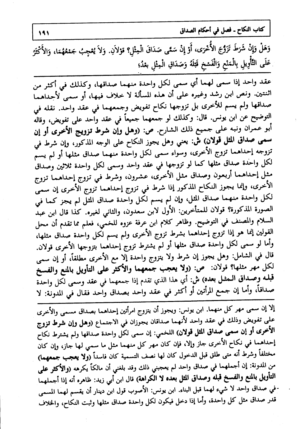 وهل وإن شرط تزوج الأخرى أو إن سمى صداق المثل قولان ولا يعجب جمعهما والأكثر على التأويل بالمنع والفسخ قبله وصداق المثل بعده؛