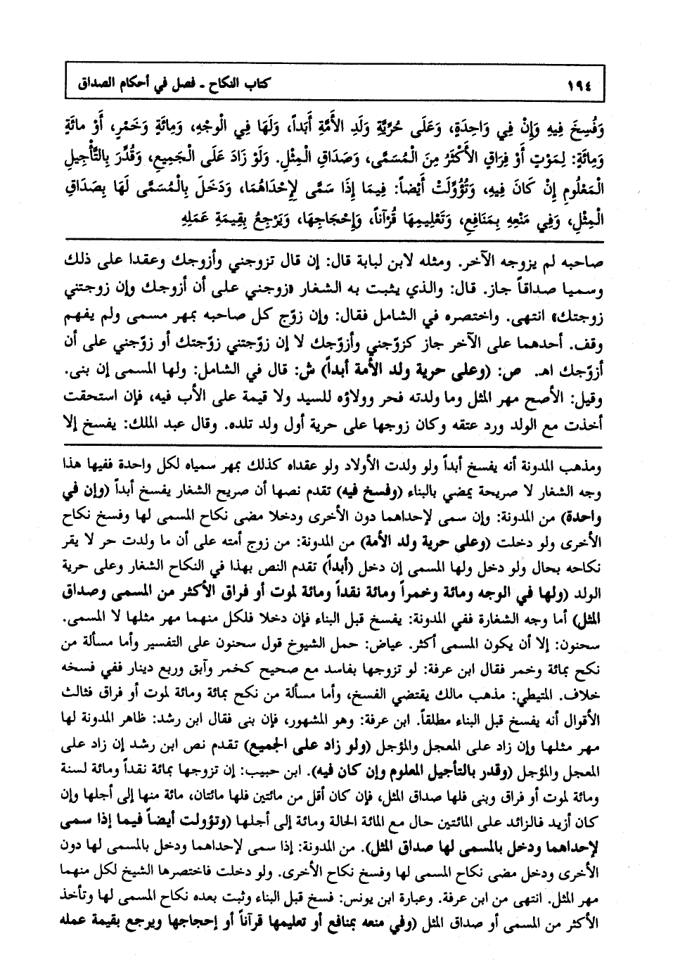 وفسخ فيه وإن في واحدة وعلى حرية ولد الأمة أبداً ولها في الوجه ومائة وخمر أو مائة ومائة لموت أو فراق الأكثر من المسمى وصداق المثل ولو زاد على الجميع وقدر بالتأجيل المعلوم إن كان فيه وتؤولت أيضا: فيما إذا سمى لإحداهما ودخل بالمسمى لها بصداق المثل وفي منعه بمنافع وتعليمها قرآناً وإحجاجها ويرجع بقيمة عمله.