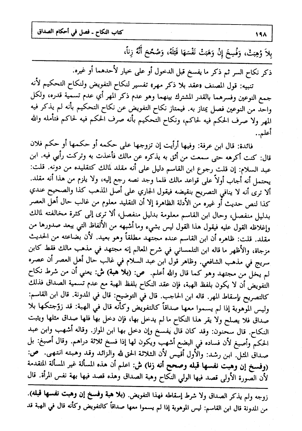 فائدة: قال ابن عرفة: وفيها أرأيت إن تزوجها على حكمه أو حكمها أو حكم فلان قال: كنت أكرهه حتى سمعت من أثق به يذكره عن مالك فأخذت به وتركت رأيي فيه ابن عبد السلام: إن قلت: رجوع ابن القاسم دليل على أنه مقلد لمالك كتقليده من دونه قلت: يحتمل أنه أجاب أولا على قواعد مالك فلما وجد نصه رجع إليه ولا يلزم من هذا أنه مقلد ألا ترى أنه لا ينافي التصريح بنقيضه فيقول الجاري على أصل المذهب كذا والصحيح عندي كذا لنص حديث أو غيره من الأدلة الظاهرة إلا أن التقليد معلوم من غالب حال أهل العصر بدليل منفصل وحال ابن القاسم معلومة بدليل منفصل ألا ترى إلى كثرة مخالفته لمالك وإغلاظه القول عليه فيقول هذا القول ليس بشيء وما أشبهه من الألفاظ التي يبعد صدورها من مقلد قلت: ظاهره أن ابن القاسم عنده مجتهد مطلقا وهو بعيد لأن بضاعته من الحديث مزجاة والأظهر ما قاله ابن التلمساني في شرح المعالم إنه مجتهد في مذهب مالك فقط كابن سريج في مذهب الشافعي وظاهر قول ابن عبد السلام في غالب حال أهل العصر أن عصره لم يخل من مجتهد وهو كما قال والله أعلم. ص: "بلا هبة" ش: يعني أن من شرط نكاح التفويض أن لا يكون بلفظ الهبة فإن عقد النكاح بلفظ الهبة مع عدم تسمية الصداق فذلك كالتصريح بإسقاط المهر قاله ابن الحاجب قال في التوضيح: قال في المدونة قال ابن القاسم: وليس الموهوبة إذا لم يسموا معها صداقا كالتفويض وكأنه قال في الهبة: قد زوجتكها بلا صداق فلا يصلح ولا يقر هذا النكاح ما لم يدخل بها فإن دخل بها فلها صداق مثلها ويثبت النكاح قال سحنون: وقد كان قال يفسخ وإن دخل بها ابن المواز وقاله أشهب وابن عبد الحكم وأصبغ لأن فساده في البضع أشهب ويكون لها إذا فسخ ثلاثة دراهم وقال أصبغ: بل صداق المثل ابن رشد: والأول أقيس لأن الثلاثة الحق لله والزائد وقد وهبته انتهى. ص: "وفسخ إن وهبت نفسها قبله وصح أنه زنا" ش: اعلم أن هذه المسألة: غير المسألة: المتقدمة لأن الصورة الأولى قصد فيها الولي النكاح وهبة الصداق وهذه قصد فيها بهة نفس المرأة. قال