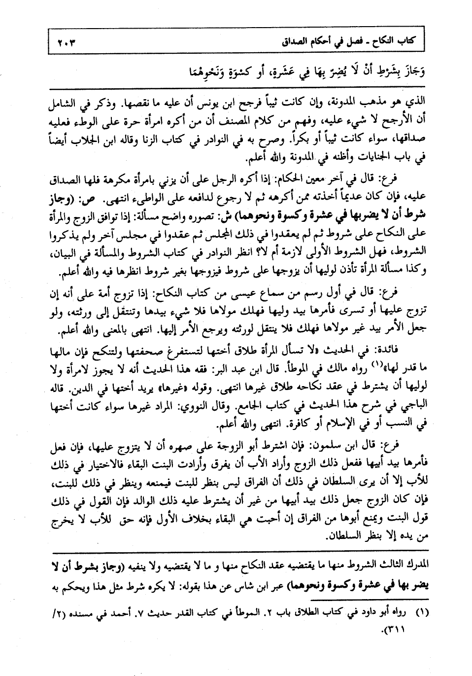 فائدة: في الحديث "لا تسأل المرأة طلاق أختها لتستفرغ صحفتها ولتنكح فإن مالها ما قدر لها" 1 رواه مالك في الموطأ قال ابن عبد البر: فقه هذا الحديث أنه لا يجوز لامرأة ولا لوليها أن يشترط في عقد نكاحه طلاق غيرها انتهى. وقوله" غيرها" يريد أختها في الدين قاله الباجي في شرح هذا الحديث في كتاب الجامع وقال النووي: المراد غيرها سواء كانت أختها في النسب أو في الإسلام أو كافرة انتهى. والله أعلم.