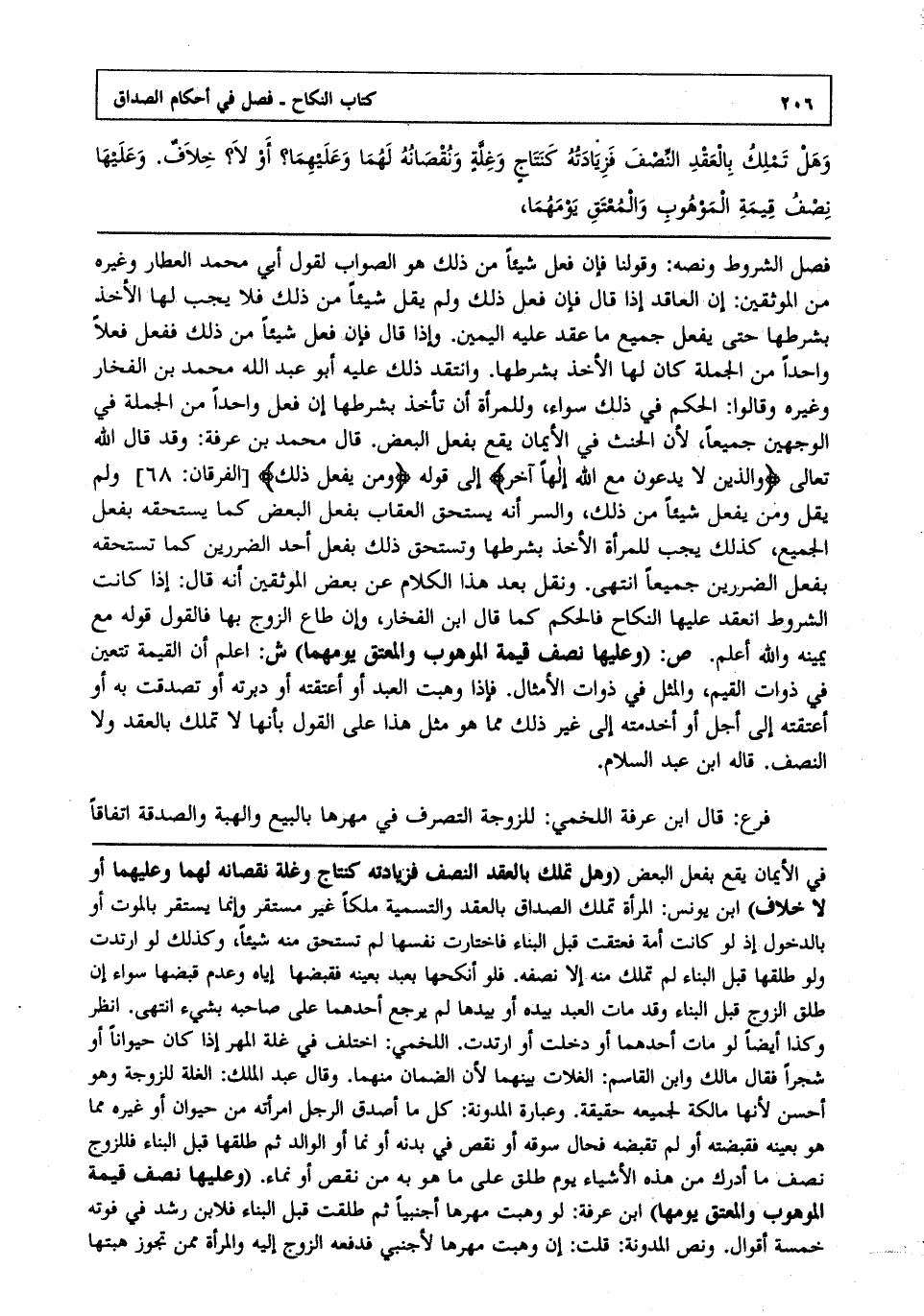 فرع: قال ابن عرفة: اللخمي للزوجة التصرف في مهرها بالبيع والهبة والصدقة اتفاقا