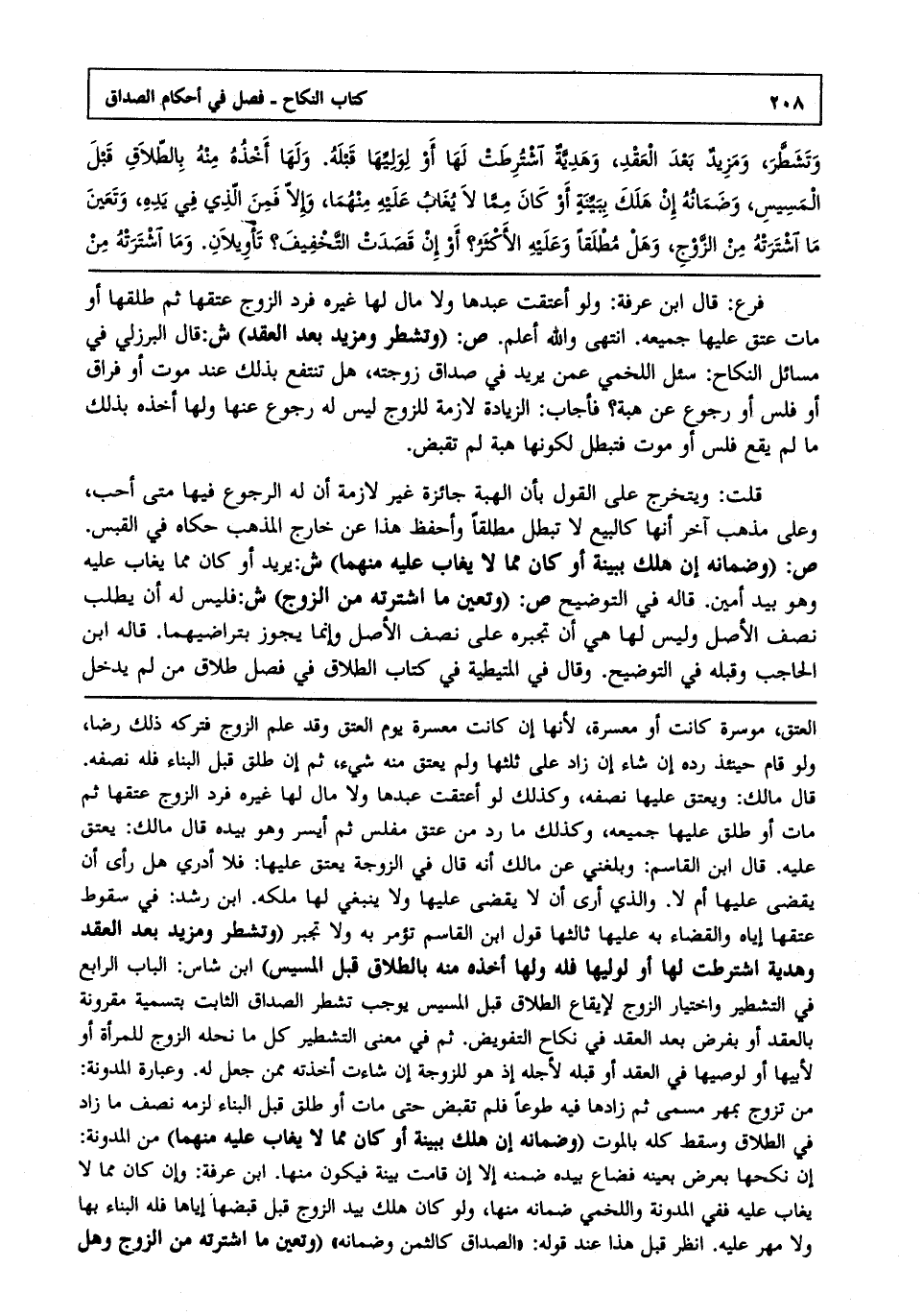 وتشطر ومزيد بعد العقد وهدية اشترطت لها أو لوليها قبله ولها أخذ منه بالطلاق قبل المسيس وضمانه إن هلك ببينة أو كان مما لايغاب عليه منهما وإلا فمن الذي في يده وتعين ما اشترته من الزوج وهل مطلقا وعليه الأكثر؟ أو إن قصدت التخفيف؟ تأويلان وما اشترته من
