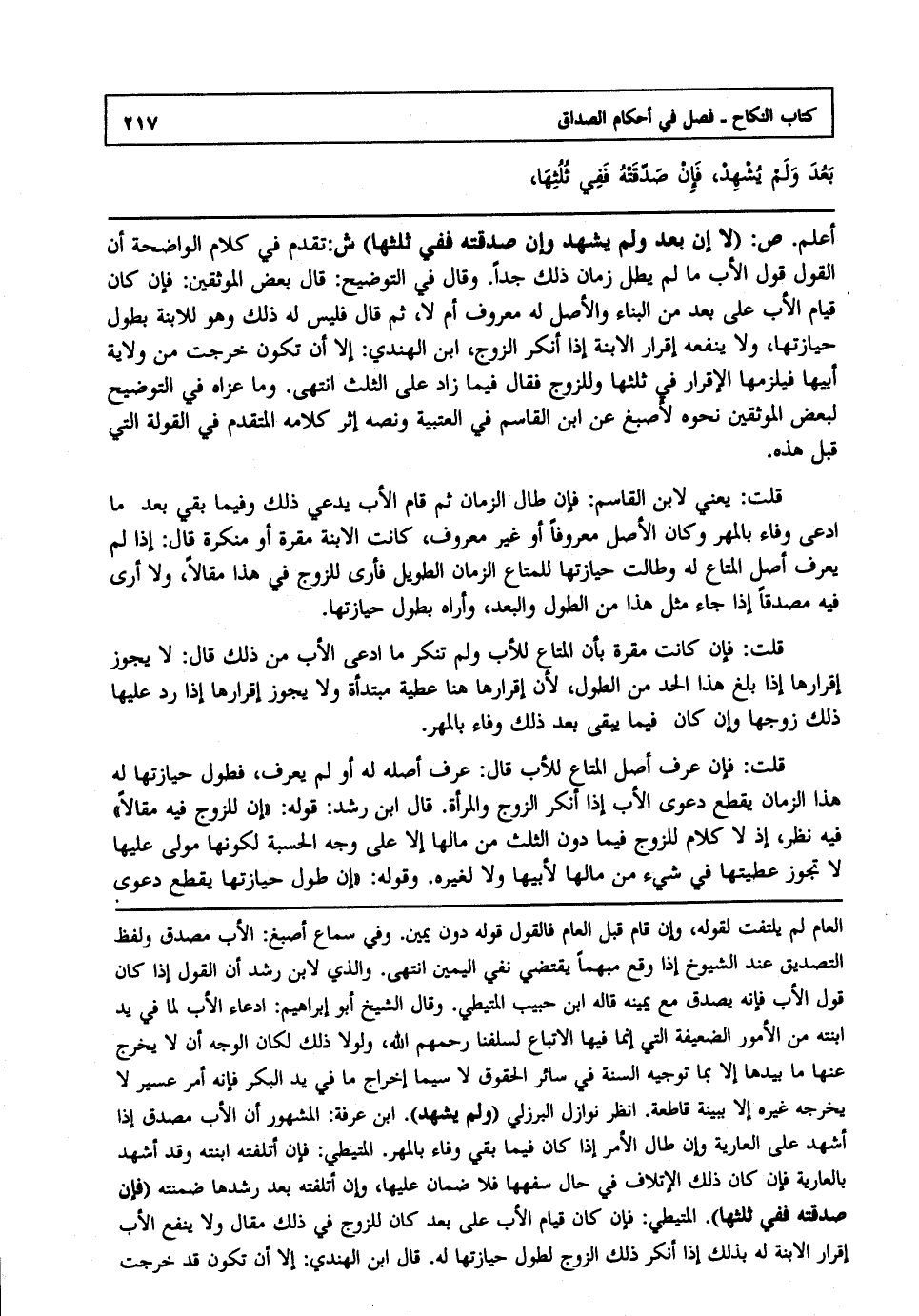 أعلم ص: "لا إن بعد ولم يشهد وإن صدقته ففي ثلثها" ش: تقدم في كلام الواضحة أن القول قول الأب ما لم يطل زمان ذلك جدا وقال في التوضيح: قال بعض الموثقين: فإن كان قيام الأب على بعد من البناء والأصل له معروف أم لا ثم قال: فليس له ذلك وهو للابنة بطول حيازتها ولا ينفعه إقرار الابنة إذا أنكر الزوج ابن الهندي: إلا أن تكون خرجت من ولاية أبيها فيلزمها الإقرار في ثلثها وللزوج فقال فيما زاد على الثلث انتهى. وما عزاه في التوضيح لبعض الموثقين نحوه لأصبغ عن ابن القاسم في العتبية ونصه إثر كلامه المتقدم في القولة التي قبل هذه.
