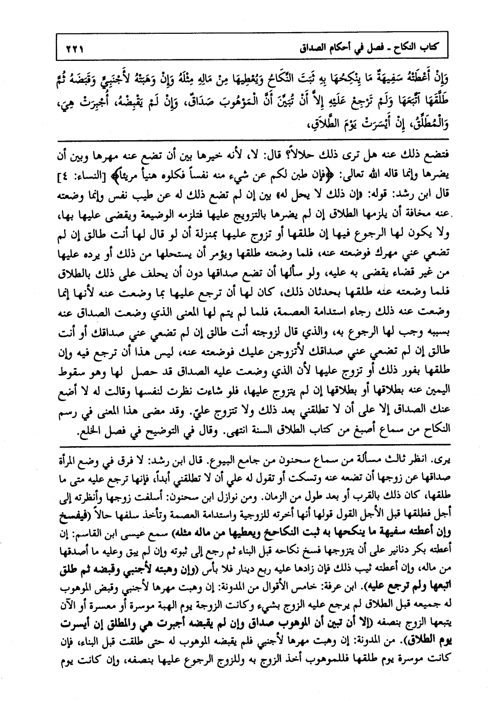 فتضع ذلك عنه هل ترى ذلك حلالا؟ قال: لا لأنه خيرها بين أن تضع عنه مهرها وبين أن يضرها وإنما قاله الله تعالى: {فَإِنْ طِبْنَ لَكُمْ عَنْ شَيْءٍ مِنْهُ نَفْساً فَكُلُوهُ هَنِيئاً مَرِيئاً} قال ابن رشد: قوله:"إن ذلك لا يحل له" بين إن لم تضع ذلك له عن طيج نفس وإنما وضعته عنه مخافة أن يلزمها الطلاق إن لم يضرها بالتزويج عليها فتلزمه الوضيعة ويقضى عليها بها ولا يكون لها الرجوع فيها إن طلقها أو تزوج عليها بمنزلة أن لو قال: لها أنت طالق إن لم تضعي عني مهرك فوضعته عنه فلما وضعته طلقها ويؤمر أن يستحلها من ذلك أو يرده عليها من غير قضاء يقضى به عليه ولو سألها أن تضع صداقها دون أن يحلف على ذلك بالطلاق فلما وضعته عنه طلقها بحدثان ذلك كان لها أن ترجع عليها بما وضعت عنه لأنها إنما وضعت عنه ذلك رجاء استدامة العصمة فلما لم يتم لها المعنى الذي وضعت الصداق عنه بسببه وجب لها الرجوع به والذي قال: لزوجته أنت طالق إن لم تضعي عني صداقك أو أنت طالق إن لم تضعي عني صداقك لأتزوجن عليك فوضعته عنه ليس هذا أن ترجع فيه وإن طلقها بفور ذلك أو تزوج عليها لأن الذي وضعت عليه الصداق قد حصل لها وهو سقوط اليمين عنه بطلاقها أو بطلاقها إن لم يتزوج عليها فلو شاءت نظرت لنفسها وقالت له لا أضع عنك الصداق إلا على أن لا تطلقني بعد ذلك ولا تتزوج علي وقد مضى هذا المعنى في رسم النكاح من سماع أصبغ من كتاب الطلاق السنة انتهى. وقال في التوضيح في فصل الخلع.