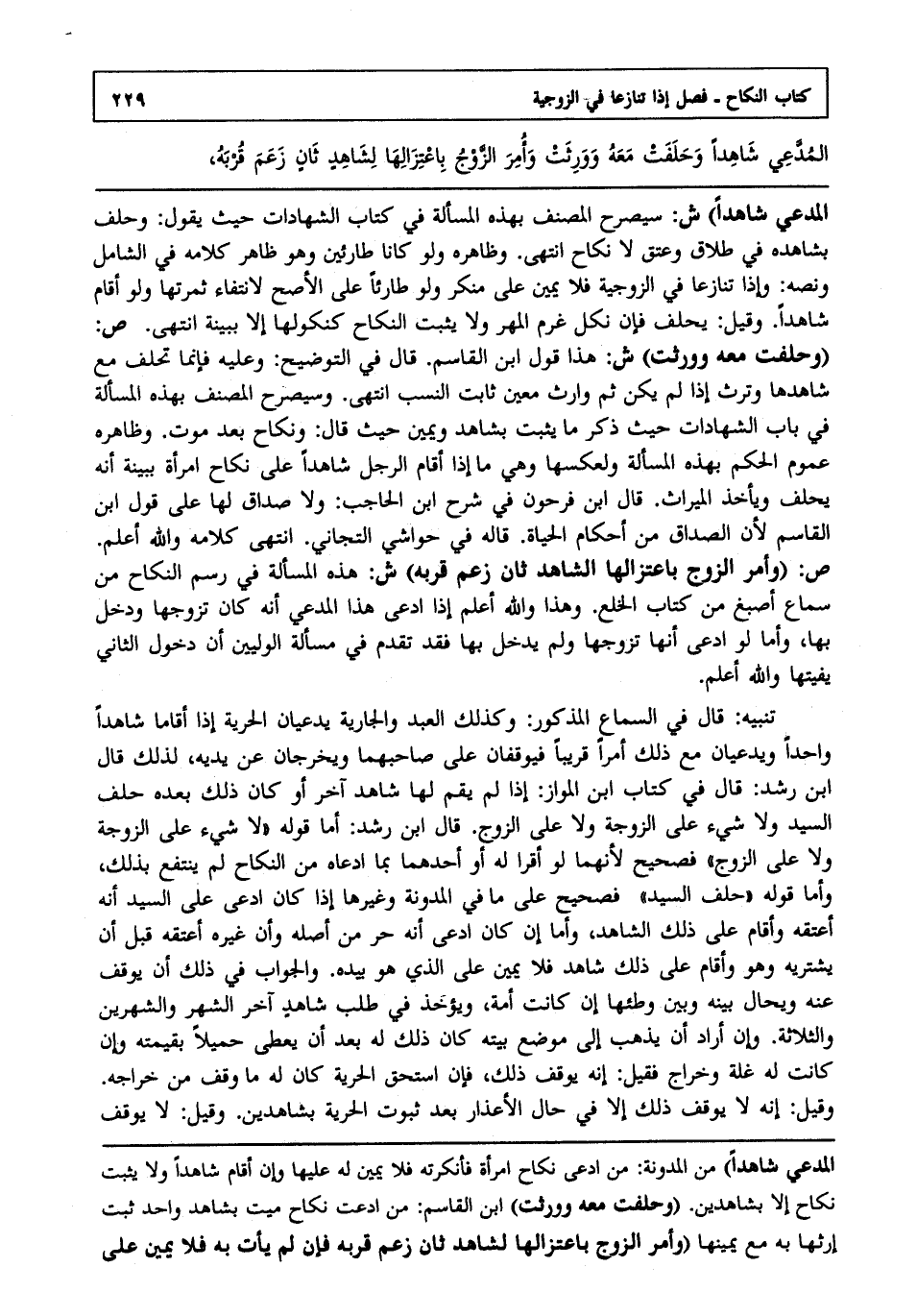 المدعي شاهدا" ش: سيصرح المصنف بهذه المسألة في كتاب الشهادات حيث يقول: وصله بشاهده في طلاق وعتق لا نكاح انتهى. وظاهره ولو كانا طارئين وهو ظاهر كلامه في الشامل ونصه: وإذا تنازعا في الزوجية فلا يمين على منكر ولو طارئا على الأصح لانتفاء ثمرتها ولو أقام شاهدا وقيل: يحلف فإن نكل غرم المهر ولا يثبت النكاح كنكولها إلا ببينة انتهى. ص: "وحلفت معه وورثت" ش: هذا قول ابن القاسم قال في التوضيح: وعليه فإنما تحلف مع شاهدها وترث إذا لم يكن عند وارث معين ثابت النسب انتهى. وسيصرح المصنف بهذه المسألة في باب الشهادات حيث ذكر ما يثبت بشاهد ويمين حيث قال: ونكاح بعد موت وظاهره عموم الحكم بهذه المسألة ولعكسها وهي ما إذا أقام الرجل شاهدا على نكاح امرأة ببينة أنه يحلف ويأخذ الميراث قال ابن فرحون: في شرح ابن الحاجب: ولا صداق لها على قول ابن القاسم لأن الصداق من أحكام الحياة قاله في حواشي التجاني انتهى. كلامه والله أعلم. ص: "وأمر الزوج باعتزالها الشاهد ثان زعم قربه" ش: هذه المسألة في رسم النكاح من سماع أصبغ من كتاب الخلع وهذا والله أعلم. إذا ادعى هذا المدعي أنه كان تزوجها ودخل بها وأما لو ادعى أنها تزوجها ولم يدخل بها فقد تقدم في مسألة الوليين أن دخول الثاني: يفيتها والله أعلم.