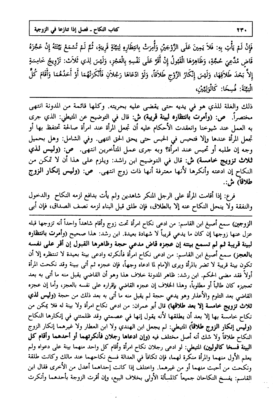 فإن لم يأت به فلا يمين على الزوجين وأمرت بانتظاره لبينة قريبة ثم لم تسمع بينته إن عجزه قاض مدعي حجة وظاهرها القبول إن أقر على نفسه بالعجز وليس لذي ثلاث: تزويج خامسة إلا بعد طلاقها وليس إنكار الزوج طلاقاً ولو ادعاها رجلان فأنكرتهما أو أحدهما وأقام كل البينة فسخا: كالوليين،