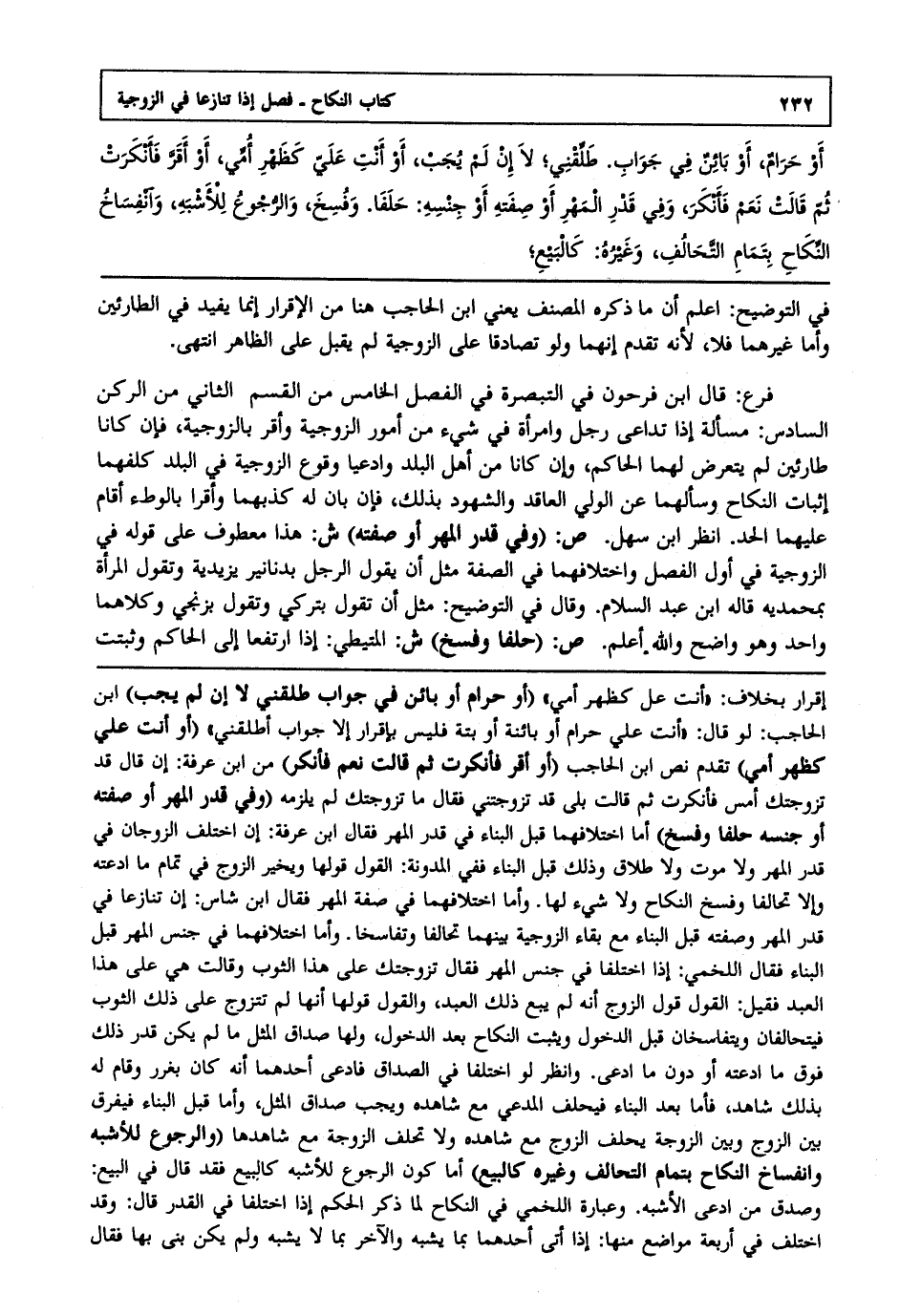 أو حرام أو بائن في جواب طلقني لا إن لم يجب أو أنت علي كظهر أمي أو أقر فأنكرت ثم قالت نعم فأنكر وفي قدر المهر أو صفته أو جنسه حلفا وفسخ والرجوع للأشبه وانفساخ النكاح بتمام التحالف وغيره كالبيع،