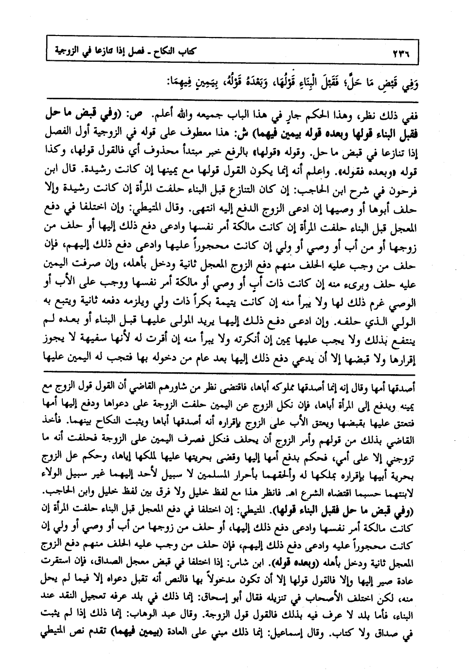 ففي ذلك نظر وهذا الحكم جار في هذا الباب جميعه والله أعلم. ص: "وفي قبض ما حل فقبل البناء قولها وبعده قوله بيمين فيهما" ش: هذا معطوف على قوله في الزوجية أول الفصل إذا تنازعا في قبض ما حل وقوله "قولها" بالرفع خبر مبتدأ محذوف أي فالقول قولها وكذا قوله "وبعده فقوله" واعلم أنه إنما يكون القول قولها مع يمينها إن كانت رشيدة قال ابن فرحون في شرح ابن الحاجب: إن كان التنازع قبل البناء حلفت المرأة إن كانت رشيدة وإلا حلف أبوها أو وصيها إن ادعى الزوج الدفع إليه انتهى. وقال المتيطي: وإن اختلفا في دفع المعجل قبل البناء حلفت المرأة إن كانت مالكة أمر نفسها وادعى دفع ذلك إليها أو حلف من زوجها أو من أب أو وصي أو ولي إن كانت محجورا عليها وادعى دفع ذلك إليهم فإن حلف من وجب عليه الحلف منهم دفع الزوج المعجل ثانية ودخل بأهله وإن صرفت اليمين عليه حلف وبرىء منه إن كانت ذات أب أو وصي أو مالكة أمر نفسها ووجب على الأب أو الوصي غرم ذلك لها ولا يبرأ منه إن كانت يتيمة بكرا ذات ولي ويلزمه دفعه ثانية ويتبع به الولي الذي حلفه وإن ادعى دفع ذلك إليها يريد المولى عليها قبل البناء أو بعده لم ينتفع بذلك ولا يجب عليها يمين إن أنكرته ولا يبرأ منه إن أقرت له لأنها سفيهة لا يجوز إقرارها ولا قبضها إلا أن يدعي دفع ذلك إليها بعد عام من دخوله بها فتجب له اليمين عليها