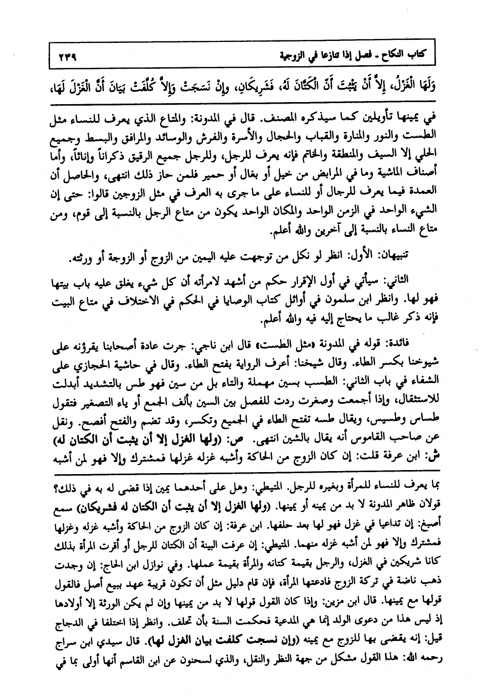الثاني: سيأتي في أول الإقرار حكم من أشهد لامرأته أن كل شيء يغلق عليه باب بيتها فهو لها وانظر ابن سلمون في أوائل كتاب الوصايا في الحكم في الاختلاف في متاع البيت فإنه ذكر غالب ما يحتاج إليه فيه والله أعلم.