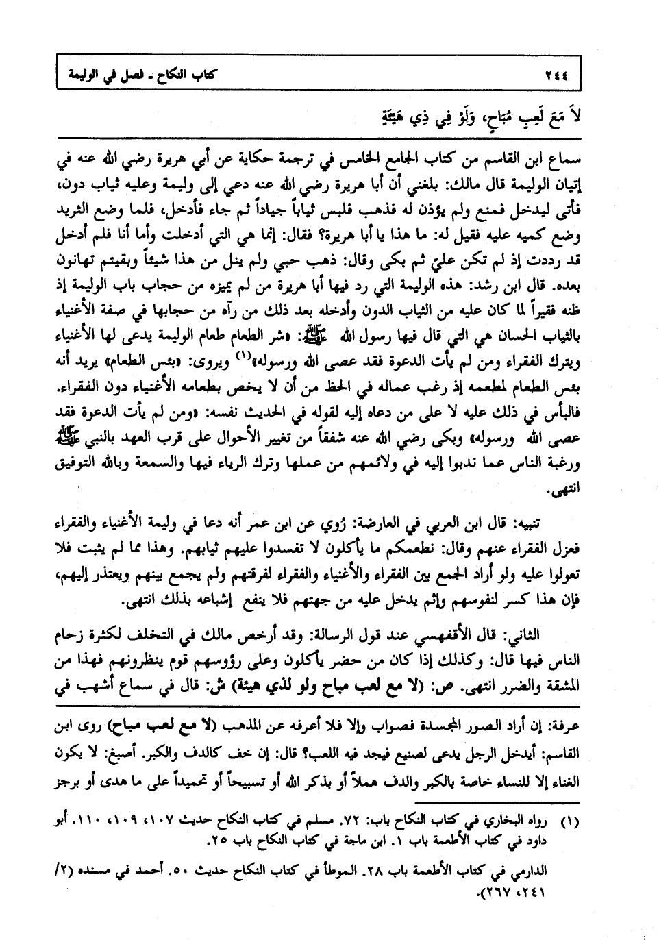 سماع ابن القاسم من كتاب الجامع الخامس في ترجمة حكاية عن أبي هريرة رضي الله عنه في إتيان الوليمة قال مالك: بلغني أن أبا هريرة رضي الله عنه دعي إلى وليمة وعليه ثياب دون فأتى ليدخل فمنع ولم يؤذن له فذهب فلبس ثيابا جيادا ثم جاء فأدخل فلما وضع الثريد وضع كميه عليه فقيل له ما هذا يا أبا هريرة فقال إنما هي التي أدخلت وأما أنا فلم أدخل قد رددت إذ لم تكن علي ثم بكى وقال ذهب حبي ولم ينل من هذا شيئا وبقيتم تهانون بعده قال ابن رشد: هذه الوليمة التي رد فيها أبا هريرة من لم يميزه من حجاب باب الوليمة إذ ظنه فقيرا لما كان عليه من الثياب الدون وأدخله بعد ذلك من رآه من حجابها في صفة الأغنياء بالثياب الحسان هي التي قال: فيها رسول الله صلى الله عليه وسلم "شر الطعام طعام الوليمة يدعى لها الأغنياء ويترك الفقراء ومن لم يأت الدعوة فقد عصى الله ورسوله" 1 ويروى "بئس الطعام" يريد أنه بئس الطعام لمطعمه إذ رغب عماله في الحظ من أن لا يخص بطعامه الأغنياء دون الفقراء فالبأس في ذلك عليه لا على من دعاه إليه لقوله في الحديث نفسه "ومن لم يأت الدعوة فقد عصى الله ورسوله" وبكى رضي الله عنه شفقا من تغيير الأحوال على قرب العهد بالنبي صلى الله عليه وسلم ورغبة الناس عما ندبوا إليه في ولائمهم من عملها وترك الرياء فيها والسمعة وبالله التوفيق انتهى.