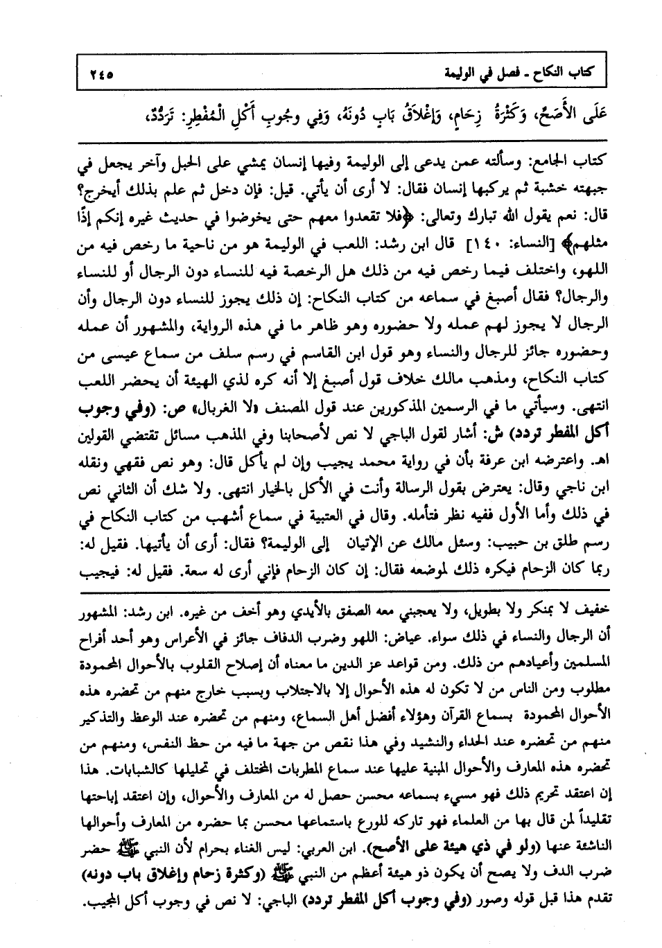 كتاب الجامع: وسألته عمن يدعى إلى الوليمة وفيها إنسان يمشي على الحبل وآخر يجعل في جبهته خشبة ثم يركبها إنسان فقال: لا أرى أن يأتي قيل: فإن دخل ثم علم بذلك أيخرج قال: نعم يقول الله تبارك وتعالى: {فَلا تَقْعُدُوا مَعَهُمْ حَتَّى يَخُوضُوا فِي حَدِيثٍ غَيْرِهِ إِنَّكُمْ إِذاً مِثْلُهُمْ} قال ابن رشد: اللعب في الوليمة هو من ناحية ما رخص فيه من اللهو واختلف فيما رخص فيه من ذلك هل الرخصة فيه للنساء دون الرجال أو للنساء والرجال فقال أصبغ في سماعه من كتاب النكاح: إن ذلك يجوز للنساء دون الرجال وأن الرجال لا يجوز لهم عمله ولا حضوره وهو ظاهر ما في هذه الرواية والمشهور أن عمله وحضوره جائز للرجال والنساء وهو قول ابن القاسم في رسم سلف من سماع عيسى من كتاب النكاح ومذهب مالك خلاف قول أصبغ إلا أنه كره لذي الهيئة أن يحضر اللعب انتهى. وسيأتي ما في الرسمين المذكورين عند قول المصنف "لا الغربال" ص: "وفي وجوب أكل المفطر تردد" ش: أشار لقول الباجي لا نص لأصحابنا وفي المذهب مسائل تقتضي القولين انتهى. واعترضه ابن عرفة بأن في رواية محمد يجيب وإن لم يأكل قال: وهو نص فقهي ونقله ابن ناجي وقال: يعترض بقول الرسالة وأنت في الأكل بالخيار انتهى. ولا شك أن الثاني: نص في ذلك وأما الأول ففيه نظر فتأمله وقال في العتبية في سماع أشهب من كتاب النكاح في رسم طلق بن حبيب: وسئل مالك عن الإتيان إلى الوليمة فقال أرى أن يأتيها فقيل له ربما كان الزحام فيكره ذلك لموضعه فقال: إن كان الزحام فإني أرى له سعة فقيل له: فيجيب