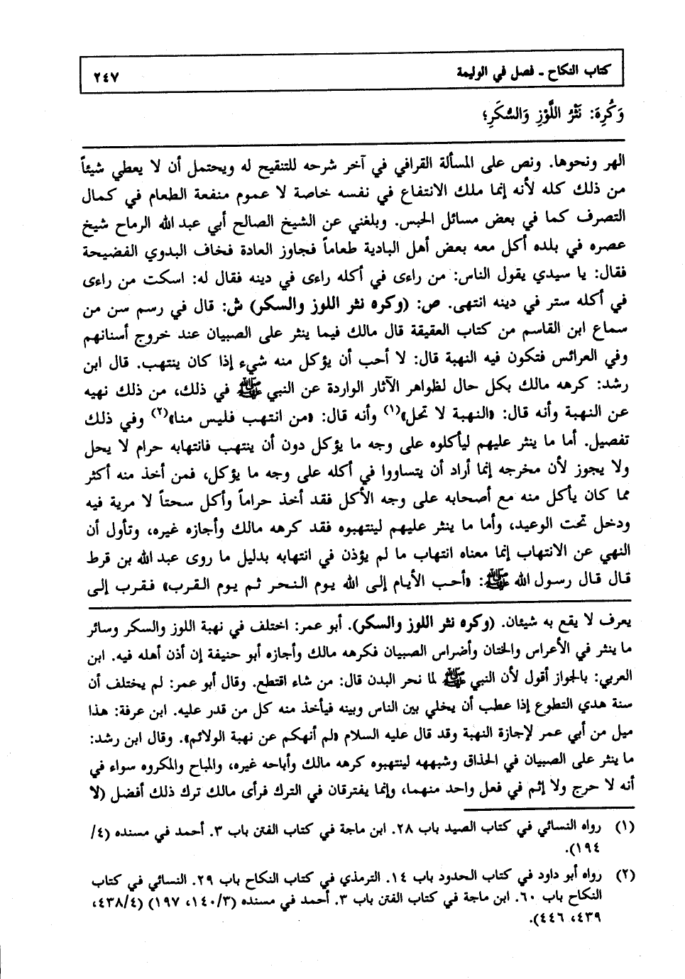 الهر ونحوها ونص على المسألة القرافي في آخر شرحه للتنقيح له ويحتمل أن لا يعطي شيئا من ذلك كله لأنه إنما ملك الانتفاع في نفسه خاصة لا عموم منفعة الطعام في كمال التصرف كما في بعض مسائل الحبس وبلغني عن الشيخ الصالح أبي عبد الله الرماح شيخ عصره في بلده أكل معه بعض أهل البادية طعاما فجاوز العادة فخاف البدوي الفضيحة فقال يا سيدي يقول الناس من راءى في أكله راءى في دينه فقال له اسكت من راءى في أكله ستر في دينه انتهى.. ص: "وكره نثر اللوز والسكر" ش: قال: في رسم سن من سماع ابن القاسم من كتاب العقيقة قال مالك: فيما ينثر ثم خروج أسنانهم وفي العرائس فتكون فيه النهبة قال: لا أحب أن يؤكل منه شيء إذا كان ينتهب قال ابن رشد: كرهه مالك بكل حال لظواهر الآثار الواردة عن النبي صلى الله عليه وسلم في ذلك من ذلك نهيه عن النهبة وأنه قال: "النهبة لا تحل" 1 وأنه قال: من "انتهب فليس منا" 2 وفي ذلك تفصيل أما ما ينثر عليهم ليأكلوه على وجه ما يؤكل دون أن ينتهب فانتهابه حرام لا يحل ولا يجوز لأن مخرجه إنما أراد أن يتساووا في أكله على وجه ما يؤكل فمن أخذ منه أكثر مما كان يأكل منه مع أصحابه على وجه الأكل فقد أخذ حراما وأكل سحتا لا مرية فيه ودخل تحت الوعيد وأما ما ينثر عليهم لينتهبوه فقد كرهه مالك وأجازه غيره وتأول أن النهي عن الانتهاب إنما معناه انتهاب ما لم يؤذن في انتهابه بدليل ما روى عبد الله بن قرط قال: قال: رسول الله صلى الله عليه وسلم "أحب الأيام إلى الله يوم النحر ثم يوم القرب" فقرب إلى