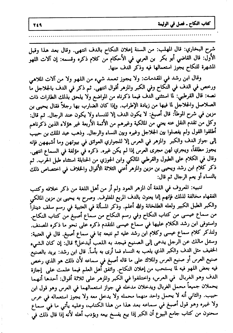 شرح البخاري قال المهلب: من السنة إعلان النكاح بالدف انتهى. وقال بعد هذا وقبل الأول قال القاضي أبو بكر بن العربي في الأحكام من كلام ذكره وقسمه: إن آلات اللهو المشهرة للنكاح يجوز استعمالها فيه وذكر الدف منها وقال ابن رشد في المقدمات: ولا يجوز تعمد شيء من اللهو ولا من آلات الملاهي ورخص في الدف في النكاح وفي الكبر والمزهر أقوال انتهى. ثم ذكر في الدف بالجلاجل ما نصه قال القرطبي: لما استثنى الدف فيما ذكرناه من المواضع ولا يلحق بذلك الطارات ذات الصلاصل والجلاجل لما فيها من زيادة الإطراب وإذا كان الضارب بها رجلا فقال يحيى بن مزين في شرح الموطأ قال أصبغ: لا يكون الدف إلا للنساء ولا يكون عند الرجال ثم قال وكل من تقدم النقل عنه يعني من المالكية وغيرهم من الأئمة الأربعة غير هؤلاء الذين ذكرناهم أطلقوا القول ولم يفصلوا بين الجلاجل وغيره وبين النساء والرجال وذهب عبد الملك بن حبيب إلى جواز الدف والكبر والمزهر في العرس إلا للجواري العواتق في بيوتهن وما أشبههن فإنه يجوز مطلقا ويجري لهن مجرى العرس إذا لم يكن غيره ذكره في مؤلفة في السماع انتهى. وقال في الكلام على الطبول والقرطبي المالكي وابن الجوزي من الحنابلة استثناء طبل الحرب ثم ذكر كلام ابن رشد ويحيى بن مزين والمزهر أعني الثلاثة الأقوال والخلاف في اختصاص ذلك بالنساء أو يعم الرجال ثم قال: