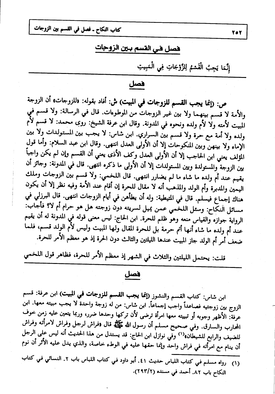 ص: إنما يجب القسم للزوجات في المبيت،" ش: أفاد بقوله للزوجات أن الزوجة والأمة لا قسم بينهما ولا بين غير الزوجات من الموطوءات قال في الرسالة: ولا قسم في المبيت لأمته ولا لأم ولده ونحوه في المدونة وقال ابن عرفة الشيخ: روى محمد: لا قسم لأم ولده ولا أمة مع حرة ولا قسم بين السراري ابن شاس: لا يجب بين المستولدات ولا بين الإماء ولا بينهن وبين المنكوحات إلا أن الأولى العدل انتهى. وقال ابن عبد السلام: وأما قول المؤلف يعني ابن الحاجب إلا أن الأولى العدل وكف الأذى يعني أن القسم وإن لم يكن واجبا بين الزوجة والمستولدة وبين المستولدات إلا أن الأولى ما ذكره انتهى. قال في المدونة: وجائز أن يقيم عند أم ولده ما شاء ما لم يضارر انتهى. قال اللخمي: ولا قسم بين الزوجات وملك اليمين والمدبرة وأم الولد والمذهب أنه لا مقال للحرة إن أقام عند الأمة وفيه نظر إلا أن يكون هناك إجماع فيسلم قال: في المتيطية وله أن يطأهن في أيام الزوجات انتهى. قال: البرزلي في مسائل النكاح وسئل اللخمي عمن يميل لسريته دون زوجته هل هو حرام أم لا؟ فأجاب: الرواية جوازه والقياس منعه وهو ظلم للحرة ابن الحاج ليس معنى قوله في المدونة له أن يقيم عند أم ولده ما شاء أنها أتم حرمة بل للحرة المقال ولها المبيت وليس لأم الولد قسم فلما ضعف أمر أم الولد جاز المبيت عندها الليلتين والثالث: دون الحرة إذ هو معظم الأمر للحرة.