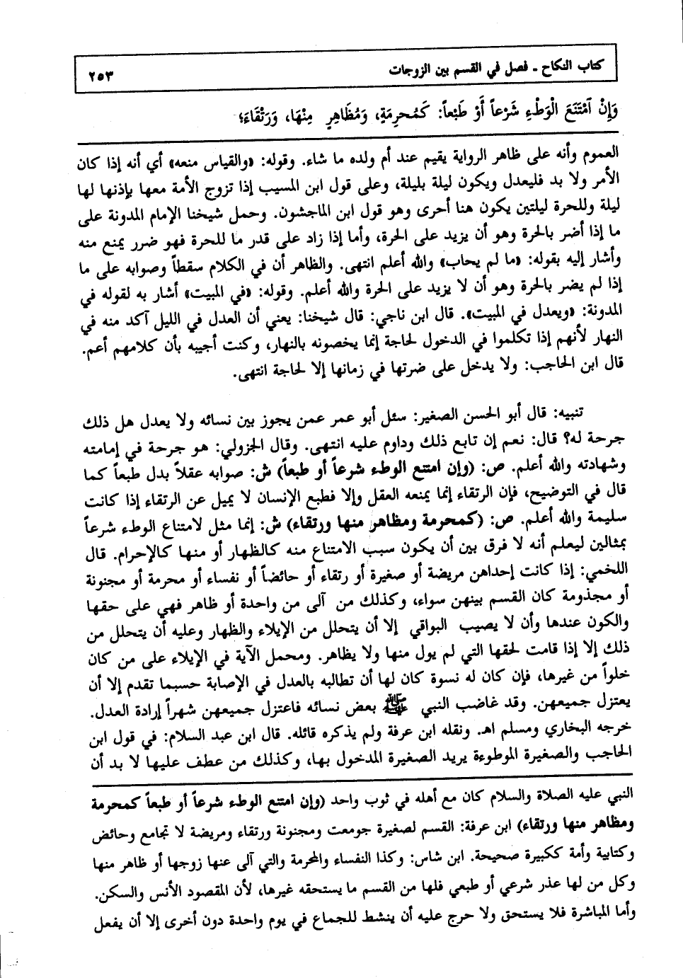 تنبيه: قال أبو الحسن: الصغير: سئل أبو عمر عمن يجوز بين نسائه ولا يعدل هل ذلك جرحة له؟ قال: نعم إن تابع ذلك وداوم عليه انتهى. وقال الجزولي: هو جرحة في إمامته وشهادته والله أعلم. ص: "وإن امتنع الوطء شرعا أو طبعا" ش: صوابه عقلا بدل طبعا كما قال في التوضيح فإن الرتقاء إنما يمنعه العقل وإلا فطبع الإنسان لا يميل عن الرتقاء إذا كانت سليمة والله أعلم. ص: "كمحرمة ومظاهر منها ورتقاء" ش: إنما مثل لامتناع الوطء شرعا بمثالين ليعلم أنه لا فرق بين أن يكون سبب الامتناع منه كالظهار أو منها كالإحرام قال اللخمي: إذا كانت إحداهن مريضة أو صغيرة أو رتقاء أو حائضا أو نفساء أو محرمة أو مجنونة أو مجذومة كان القسم بينهن سواء وكذلك من آلى من واحدة أو ظاهر فهي على حقها والكون عندها وأن لا يصيب البواقي إلا أن يتحلل من الإيلاء والظهار وعليه أن يتحلل من ذلك إلا إذا قامت لحقها التي لم يول منها ولا يظاهر ومحمل الآية في الإيلاء على من كان خلوا من غيرها فإن كان له نسوة كان لها أن تطالبه بالعدل في الإصابة حسبما تقدم إلا أن يعتزل جميعهن وقد غاضب النبي صلى الله عليه وسلم بعض نسائه فاعتزل جميعهن شهرا إرادة العدل خرجه البخاري ومسلم انتهى. ونقله ابن عرفة ولم يذكره قائله قال ابن عبد السلام: في قول ابن الحاجب والصغيرة الموطوءة يريد الصغيرة المدخول بها وكذلك من عطف عليها لا بد أن