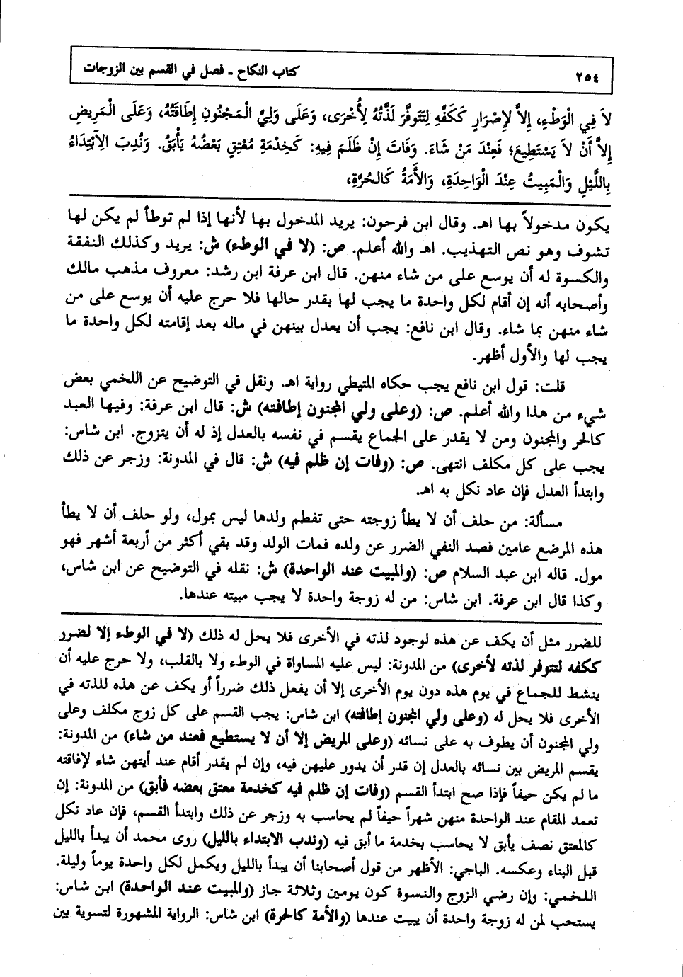 قلت: قول ابن نافع يجب حكاه المتيطي رواية انتهى. ونقل في التوضيح عن اللخمي بعض شيء من هذا والله أعلم. ص: "وعلى ولي المجنون إطافته" ش: قال ابن عرفة: وفيها العبد كالحر والمجنون ومن لا يقدر على الجماع يقسم في نفسه بالعدل إذ له أن يتزوج ابن شاس: يجب على كل مكلف انتهى. ص: "وفات إن ظلم فيه" ش: قال في المدونة: وزجر عن ذلك وابتدأ العدل فإن عاد نكل به انتهى.