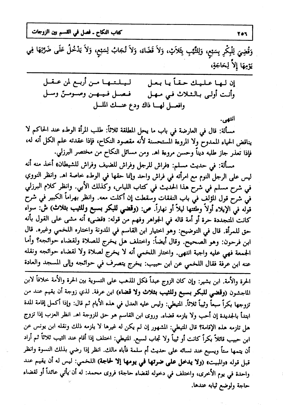 مسألة: في حديث مسلم:"فراش للرجل وفراش للضيف وفراش للشيطان" أخذ منه أنه ليس على الرجل النوم مع امرأته في فراش واحد وإنما حقها في الوطء خاصة انتهى. وانظر النووي في شرح مسلم في شرح هذا الحديث في كتاب اللباس وكذلك الأبي وانظر كلام البرزلي في شرح قول المؤلف في باب النفقات وسقطت إن اختلفا معه وانظر بهراما الكبير في شرح قوله في الإيلاء أولا وطئتها ليلا أو نهارا ص: "وقضي للبكر بسبع وللثيب بثلاث" ش: سواء كانت المتجددة حرة أو أمة قاله في الجواهر وفهم من قوله:"قضى" أنه مشى على القول بأنه حق للمرأة قال في التوضيح: وهو اختيار ابن القاسم في المدونة واختاره اللخمي وغيره قال ابن فرحون: وهو الصحيح وقال أيضا واختلف هل يخرج للصلاة ولقضاء حوائجه وأما الجمعة فهي عليه واجبة انتهى. واختار اللخمي أنه لا يخرج لصلاة ولا لقضاء حوائجه ونقله عنه ابن عرفة فقال اللخمي عن ابن حبيب يخرج يتصرف في حوائجه وإلى المسجد والعادة
