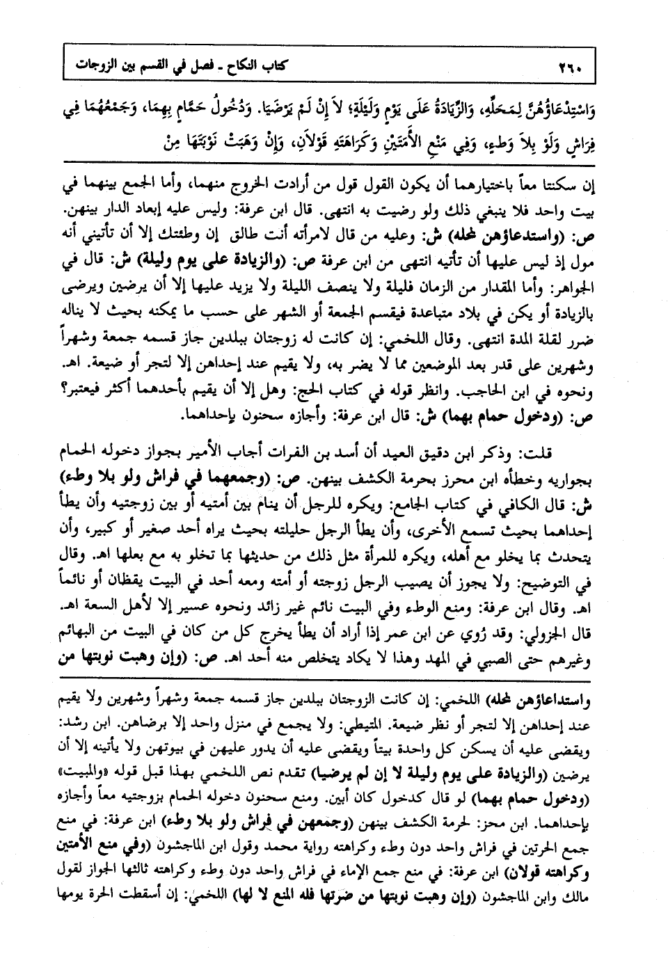 قلت: وذكر ابن دقيق العيد أن أسد بن الفرات أجاب الأمير بجواز دخوله الحمام بجواريه وخطأه ابن محرز بحرمة الكشف بينهن ص: "وجمعهما في فراش ولو بلا وطء" ش: قال الكافي في كتاب الجامع: ويكره للرجل أن ينام بين أمتيه أو بين زوجتيه وأن يطأ إحداهما بحيث تسمع الأخرى وأن يطأ الرجل حليلته بحيث يراه أحد صغير أو كبير وأن يتحدث بما يخلو مع أهله ويكره للمرأة مثل ذلك من حديثها بما تخلو به مع بعلها انتهى. وقال في التوضيح ولا يجوز أن يصيب الرجل زوجته أو أمته ومعه أحد في البيت يقظان أو نائما انتهى. وقال ابن عرفة: ومنع الوطء وفي البيت نائم غير زائد ونحوه عسير إلا لأهل السعة انتهى. قال الجزولي: وقد روي عن ابن عمر إذا أراد أن يطأ يخرج كل من كان في البيت من البهائم وغيرهم حتى الصبي في المهد وهذا لا يكاد يتخلص منه أحد انتهى. ص: "وإن وهبت نوبتها من