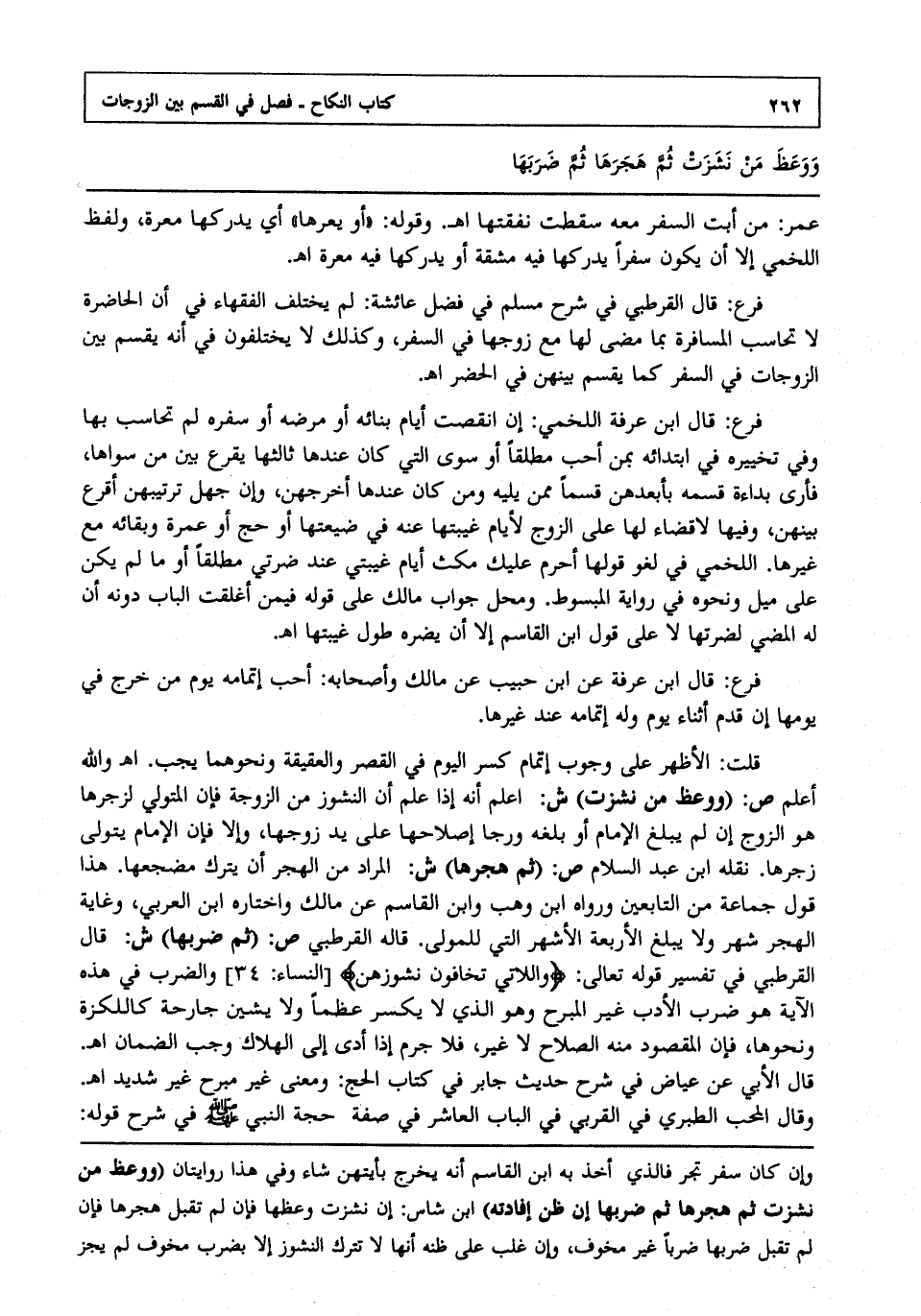 فرع: قال القرطبي في شرح مسلم في فضل عائشة: لم يختلف الفقهاء في أن الحاضرة لا تحاسب المسافرة بما مضى لها مع زوجها في السفر وكذلك لا يختلفون في أنه يقسم بين الزوجات في السفر كما يقسم بينهن في الحضر انتهى.