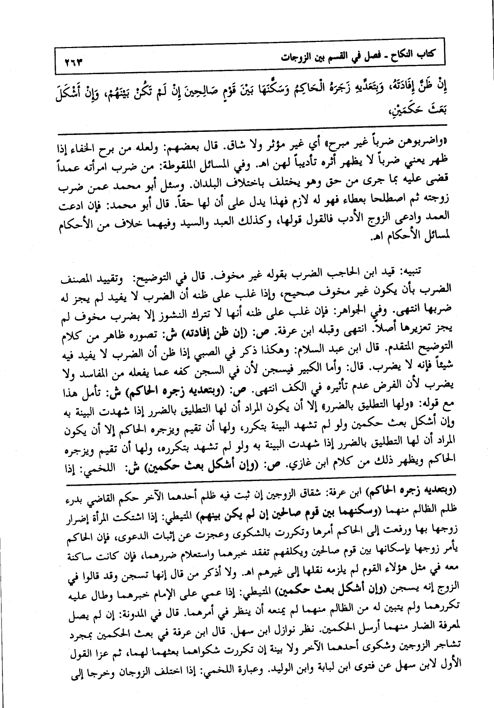 تنبيه: قيد ابن الحاجب الضرب بقوله غير مخوف قال في التوضيح: وتقييد المصنف الضرب بأن يكون غير مخوف صحيح وإذا غلب على ظنه أن الضرب لا يفيد لم يجز له ضربها انتهى. وفي الجواهر: فإن غلب على ظنه أنها لا تترك النشوز إلا بضرب مخوف لم يجز تعزيرها أصلا انتهى. وقبله ابن عرفة ص: "إن ظن إفادته" ش: تصوره ظاهر من كلام التوضيح المتقدم قال ابن عبد السلام: وهكذا ذكر في الصبي إذا ظن أن الضرب لا يفيد فيه شيئا فإنه لا يضرب قال: وأما الكبير فيسجن لأن في السجن كفه عما يفعله من المفاسد ولا يضرب لأن الفرض عدم تأثيره في الكف انتهى. ص: "وبتعديه زجره الحاكم" ش: تأمل هذا مع قوله:"ولها التطليق بالضرر" إلا أن يكون المراد أن لها التطليق بالضرر إذا شهدت البينة به وإن أشكل بعث حكمين ولو لم تشهد البينة بتكرر ولها أن تقيم ويزجره الحاكم إلا أن يكون المراد أن لها التطليق بالضرر إذا شهدت البينة به ولو لم تشهد بتكرره ولها أن تقيم ويزجره الحاكم ويظهر ذلك من كلام ابن غازي ص: "وإن أشكل بعث حكمين" ش: اللخمي: إذا
