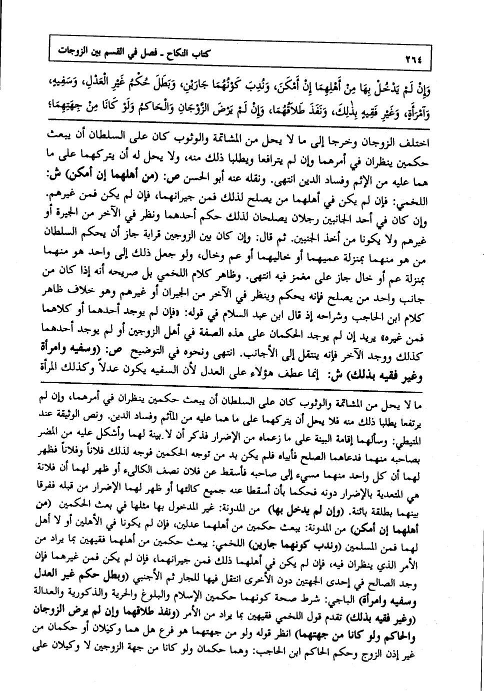 اختلف الزوجان وخرجا إلى ما لا يحل من المشاتمة والوثوب كان على السلطان أن يبعث حكمين ينظران في أمرهما وإن لم يترافعا ويطلبا ذلك منه ولا يحل له أن يتركهما على ما هما عليه من الإثم وفساد الدين انتهى. ونقله عنه أبو الحسن ص: "من أهلهما إن أمكن" ش: اللخمي فإن لم يكن في أهلهما من يصلح لذلك فمن جيرانهما فإن لم يكن فمن غيرهم وإن كان في أحد الجانبين رجلان يصلحان لذلك حكم أحدهما ونظر في الآخر من الجيرة أو غيرهم ولا يكونا من أخذ الجنبين ثم قال: وإن كان بين الزوجين قرابة جاز أن يحكم السلطان من هو منهما بمنزلة عميهما أو خاليهما أو عم وخال ولو جعل ذلك إلى واحد هو منهما بمنزلة عم أو خال جاز على مغمز فيه انتهى. وظاهر كلام اللخمي بل صريحه أنه إذا كان من جانب واحد من يصلح فإنه يحكم وينظر في الآخر من الجيران أو غيرهم وهو خلاف ظاهر كلام ابن الحاجب وشراحه إذ قال ابن عبد السلام: في قوله:"فإن لم يوجد أحدهما أو كلاهما فمن غيره" يريد إن لم يوجد الحكمان على هذه الصفة في أهل الزوجين أو لم يوجد أحدهما كذلك ووجد الآخر فإنه ينتقل إلى الأجانب انتهى. ونحوه في التوضيح ص: "وسفيه وامرأة وغير فقيه بذلك" ش: إنما عطف هؤلاء على العدل لأن السفيه يكون عدلا وكذلك المرأة