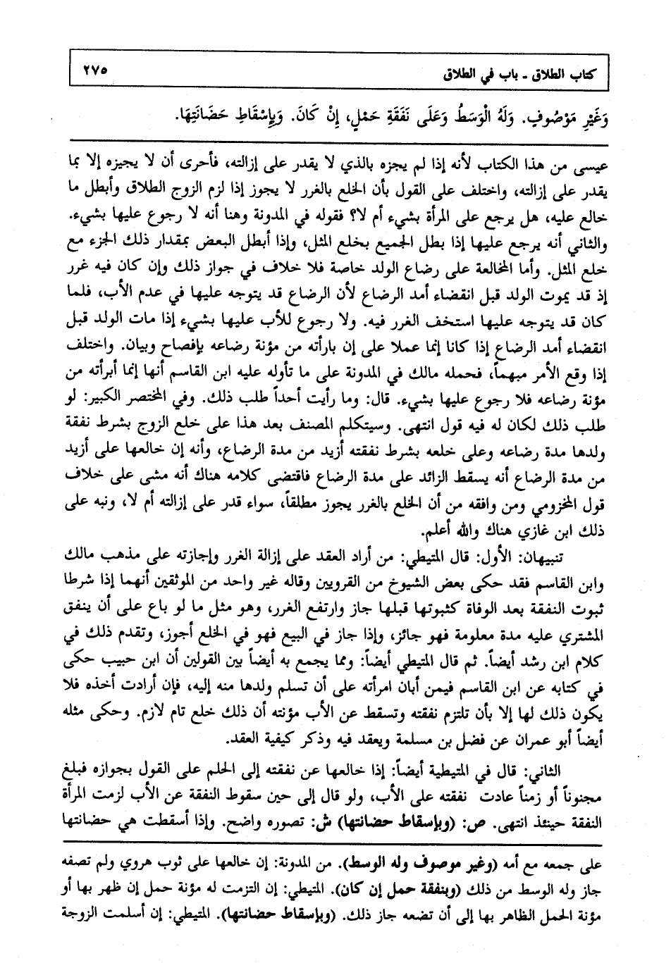 تنبيهان: الأول: قال المتيطي: من أراد العقد على إزالة الغرر وإجازته على مذهب مالك وابن القاسم فقد حكى بعض الشيوخ من القرويين وقاله غير واحد من الموثقين أنهما إذا شرطا ثبوت النفقة بعد الوفاة كثبوتها قبلها جاز وارتفع الغرر وهو مثل ما لو باع على أن ينفق المشتري عليه مدة معلومة فهو جائز وإذا جاز في البيع فهو في الخلع أجوز وتقدم ذلك في كلام ابن رشد أيضا ثم قال المتيطي: أيضا ومما يجمع به أيضا بين القولين أن ابن حبيب حكى في كتابه عن ابن القاسم فيمن أبان امرأته على أن تسلم ولدها منه إليه فإن أرادت أخذه فلا يكون ذلك لها إلا بأن تلتزم نفقته وتسقط عن الأب مؤنته أن ذلك خلع تام لازم وحكى مثله أيضا أبو عمران عن فضل بن مسلمة ويعقد فيه وذكر كيفية العقد.