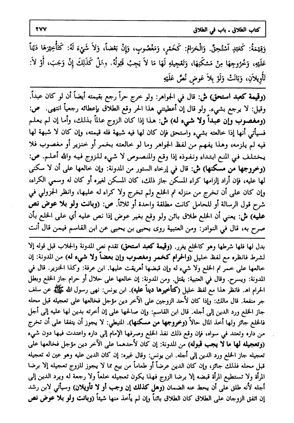 "وقيمة كعبد استحق" ش: قال في الجواهر: ولو خرج حرا رجع بقيمته أيضا أن لو كان عبدا وقيل: لا يرجع بشيء ولو قال إن أعطيتني هذا الحر وقع الطلاق بإعطائه رجعيا انتهى. ص: "ومغصوب وإن عبدا ولا شيء له" ش: هذا إذا كان الزوج عالما بذلك وأما إن لم يعلم فسيأتي أنها إذا خالعته بشيء واستحق فإن كان لها فيه شبهة فله قيمته وإن كان لا شبهة لها فيه لم يلزمه وهذا يفهم من لفظ الجواهر وما لو خالعته بخمر أو خنزير أو مغصوب فلا يختلف في المنع ابتداء ونفوذه إذا وقع والمنصوص لا شيء للزوج فيه والله أعلم. ص: "وخروجها من مسكنها" ش: قال: في إرخاء الستور من المدونة وإن خالعها على أن لا سكنى لها عليه فإن أراد إلزامها كراء المسكن جاز ذلك كان المسكن لغيره أو كان له وسمي الكراء وإن كان على أن تخرج من منزله تم الخلع ولم تخرج ولا كراء له عليها وانظر الجزولي في شرح قول الرسالة أو للحامل كانت مطلقة واحدة أو ثلاثا ص: "وبانت ولو بلا عوض نص عليه" ش: يعني أن الخلع طلاق بائن ولو وقع بغير عوض إذا نص عليه أي على الخلع بأن صرح به قال في النوادر: ومن العتبية روى يحيى بن يحيى عن ابن القاسم فيمن قال أنت