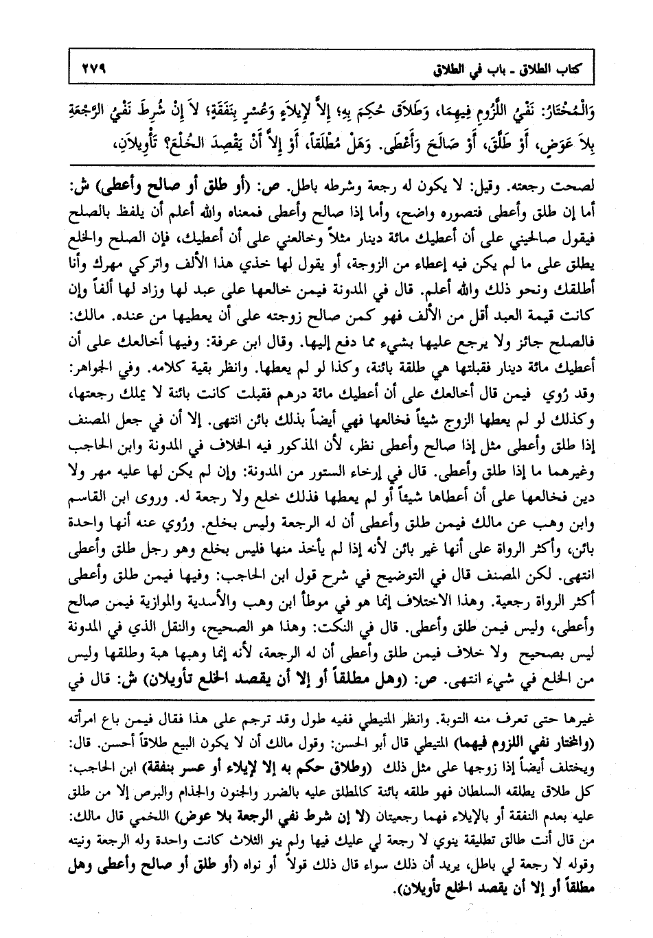 والمختار: نفي اللزوم فيهما، وطلاق حكم به؛ إلا لإيلاء وعسر بنفقة؛ لا إن شرط نفي الرجعة بلا عوض، أو طلق، أو صالح وأعطى. وهل مطلقا، أو إلا أن يقصد الخلع؟ تأويلان،