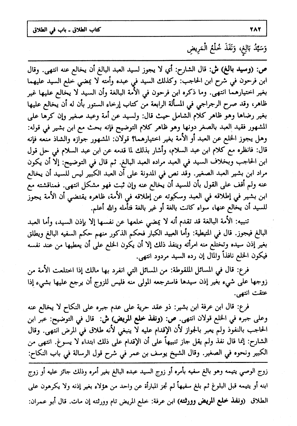 ص وسيد بالغ" ش: قال الشارح: أي لا يجوز لسيد العبد البالغ أن يخالع عنه انتهى. وقال ابن فرحون في شرح ابن الحاجب: وكذلك السيد في عبده وأمته لا يمضي خلع السيد عليهما بغير اختيارهما انتهى. وما ذكره ابن فرحون في الأمة البالغة وأن السيد لا يخالع عليها غير ظاهر وقد صرح الرجراجي في المسألة الرابعة من كتاب إرخاء الستور بأن له أن يخالع عليها بغير رضاها وهو ظاهر كلام الشامل حيث قال: ولسيد عن أمة وعبد صغير وإن كرها على المشهور فقيد العبد بالصغر دونها وهو ظاهر كلام التوضيح فإنه بحث مع ابن بشير في قوله وهل يجوز الخلع عن العبد أو الأمة بغير اختيارهما قولان المشهور جوازه والشاذ منعه فإنه قال: فانظره مع كلام ابن عبد السلام وأشار بذلك لما قدمه عن ابن عبد السلام في حل قول ابن الحاجب وبخلاف السيد في العبد مراده العبد البالغ ثم قال في التوضيح: إلا أن يكون مراد ابن بشير العبد الصغير وقد نص في المدونة على أن العبد الكبير ليس للسيد أن يخالع عنه ولم أقف على القول بأن للسيد أن يخالع عنه وإن ثبت فهو مشكل انتهى. فمناقشته مع ابن بشير في إطلاقه في العبد وسكوته عن إطلاقه في الأمة ظاهره يقتضي أن الأمة يجوز للسيد أن يخالع عنها سواء كانت بالغة أو غير بالغة فتأمله والله أعلم.