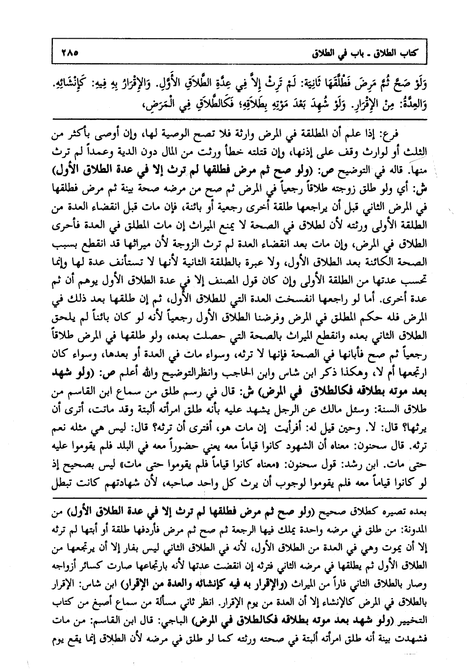 فرع: إذا علم أن المطلقة في المرض وارثة فلا تصح الوصية لها وإن أوصى بأكثر من الثلث أو لوارث وقف على إذنها وإن قتلته خطأ ورثت من المال دون الدية وعمدا لم ترث منها قاله في التوضيح ص: "ولو صح ثم مرض فطلقها لم ترث إلا في عدة الطلاق الأول" ش: أي ولو طلق زوجته طلاقا رجعيا في المرض ثم صح من مرضه صحة بينة ثم مرض فطلقها في المرض الثاني: قبل أن يراجعها طلقة أخرى رجعية أو بائنة فإن مات قبل انقضاء العدة من الطلقة الأولى ورثته لأن لطلاق في الصحة لا يمنع الميراث إن مات المطلق في العدة فأحرى الطلاق في المرض وإن مات بعد انقضاء العدة لم ترث الزوجة لأن ميراثها قد انقطع بسبب الصحة الكائنة بعد الطلاق الأول ولا عبرة بالطلقة الثانية لأنها لا تستأنف عدة لها وإنما تحسب عدتها من الطلقة الأولى وإن كان قول المصنف إلا في عدة الطلاق الأول يوهم أن ثم عدة أخرى أما لو راجعها انفسخت العدة التي للطلاق الأول ثم إن طلقها بعد ذلك في المرض فله حكم المطلق في المرض وفرضنا الطلاق الأول رجعيا لأنه لو كان بائنا لم يلحق الطلاق الثاني: بعده وانقطع الميراث بالصحة التي حصلت بعده ولو طلقها في المرض طلاقا رجعيا ثم صح فأبانها في الصحة فإنها لا ترثه وسواء مات في العدة أو بعدها وسواء كان ارتجعها أم لا وهكذا ذكر ابن شاس وابن الحاجب وانظر التوضيح والله أعلم. ص: "ولو شهد بعد موته بطلاقه فكالطلاق في المرض" ش: قال: في رسم طلق من سماع ابن القاسم من طلاق السنة وسئل مالك عن الرجل يشهد عليه بأنه طلق امرأته ألبتة وقد ماتت أترى أن يرثها قال: لا وحين قيل له أفرأيت إن مات هو أفترى أن ترثه قال: ليس هي مثله نعم ترثه قال سحنون: معناه أن الشهود كانوا قياما معه يعني حضورا معه في البلد فلم يقوموا عليه حتى مات ابن رشد قول سحنون: "معناه كانوا قياما فلم يقوموا حتى مات" ليس بصحيح إذ لو كانوا قياما معه فلم يقوموا لوجوب أن يرث كل واحد صاحبه لأن شهادتهم كانت تبطل