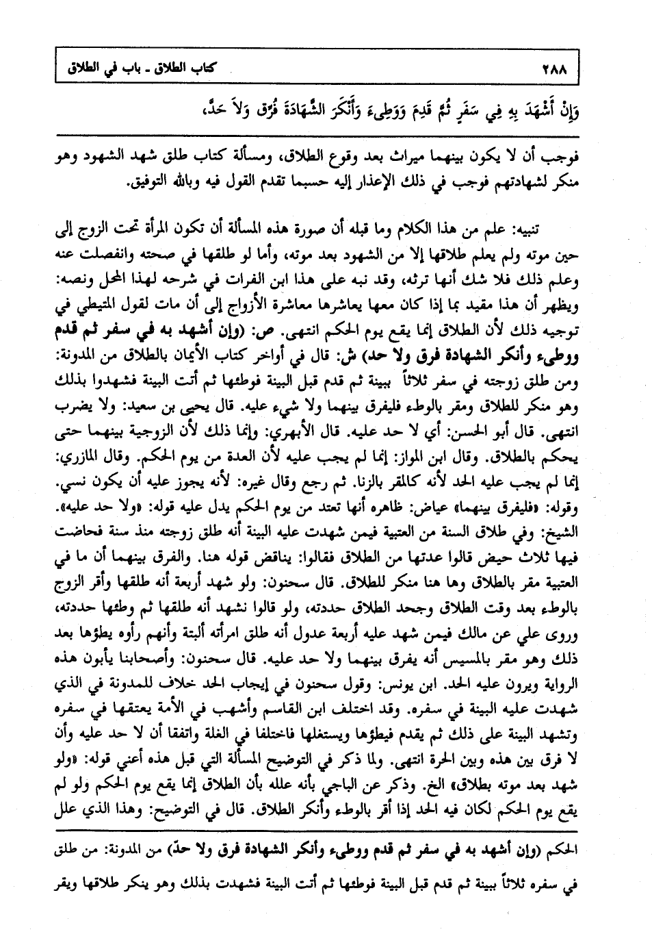 تنبيه: علم من هذا الكلام وما قبله أن صورة هذه المسألة أن تكون المرأة تحت الزوج إلى حين موته ولم يعلم طلاقها إلا من الشهود بعد موته وأما لو طلقها في صحته وانفصلت عنه وعلم ذلك فلا شك أنها ترثه وقد نبه على هذا ابن الفرات في شرحه لهذا المحل ونصه ويظهر أن هذا مقيد بما إذا كان معها يعاشرها معاشرة الأزواج إلى أن مات لقول المتيطي في توجيه ذلك لأن الطلاق إنما يقع يوم الحكم انتهى. ص: "وإن أشهد به في سفر ثم قدم ووطئ وأنكر الشهادة فرق ولا حد" ش: قال: في أواخر كتاب الأيمان بالطلاق من المدونة: ومن طلق زوجته في سفر ثلاثا ببينة ثم قدم قبل البينة فوطئها ثم أتت البينة فشهدوا بذلك وهو منكر للطلاق ومقر بالوطء فليفرق بينهما ولا شيء عليه قال يحيى بن سعيد: ولا يضرب انتهى. قال أبو الحسن: أي لا حد عليه قال الأبهري: وإنما ذلك لأن الزوجية بينهما حتى يحكم بالطلاق وقال ابن المواز إنما لم يجب عليه لأن العدة من يوم الحكم وقال المازري: إنما لم يجب عليه الحد لأنه كالمقر بالزنا ثم رجع وقال غيره لأنه يجوز عليه أن يكون نسي وقوله فليفرق بينهما عياض ظاهره أنها تعتد من يوم الحكم يدل عليه قوله: "ولا حد عليه" الشيخ وفي طلاق السنة من العتبية فيمن شهدت عليه البينة أنه طلق زوجته منذ سنة فحاضت فيها ثلاث حيض قالوا عدتها من الطلاق فقالوا يناقض قوله هنا والفرق بينهما أن ما في العتبية مقر بالطلاق وها هنا منكر للطلاق قال سحنون: ولو شهد أربعة أنه طلقها وأقر الزوج بالوطء بعد وقت الطلاق وجحد الطلاق حددته ولو قالوا نشهد أنه طلقها ثم وطئها حددته وروى علي عن مالك فيمن شهد عليه أربعة عدول أنه طلق امرأته ألبتة وأنهم رأوه يطؤها بعد ذلك وهو مقر بالمسيس أنه يفرق بينهما ولا حد عليه قال سحنون: وأصحابنا يأبون هذه الرواية ويرون عليه الحد ابن يونس وقول سحنون في إيجاب الحد خلاف للمدونة في الذي شهدت عليه البينة في سفره وقد اختلف ابن القاسم وأشهب في الأمة يعتقها في سفره وتشهد البينة على ذلك ثم يقدم فيطؤها ويستغلها فاختلفا في الغلة واتفقا أن لا حد عليه وأن لا فرق بين هذه وبين الحرة انتهى. ولما ذكر في التوضيح المسألة التي قبل هذه أعني قوله: "ولو شهد بعد موته بطلاق" الخ وذكر عن الباجي بأنه علله بأن الطلاق إنما يقع يوم الحكم ولو لم يقع يوم الحكم لكان فيه الحد إذا أقر بالوطء وأنكر الطلاق قال في التوضيح: وهذا الذي علل