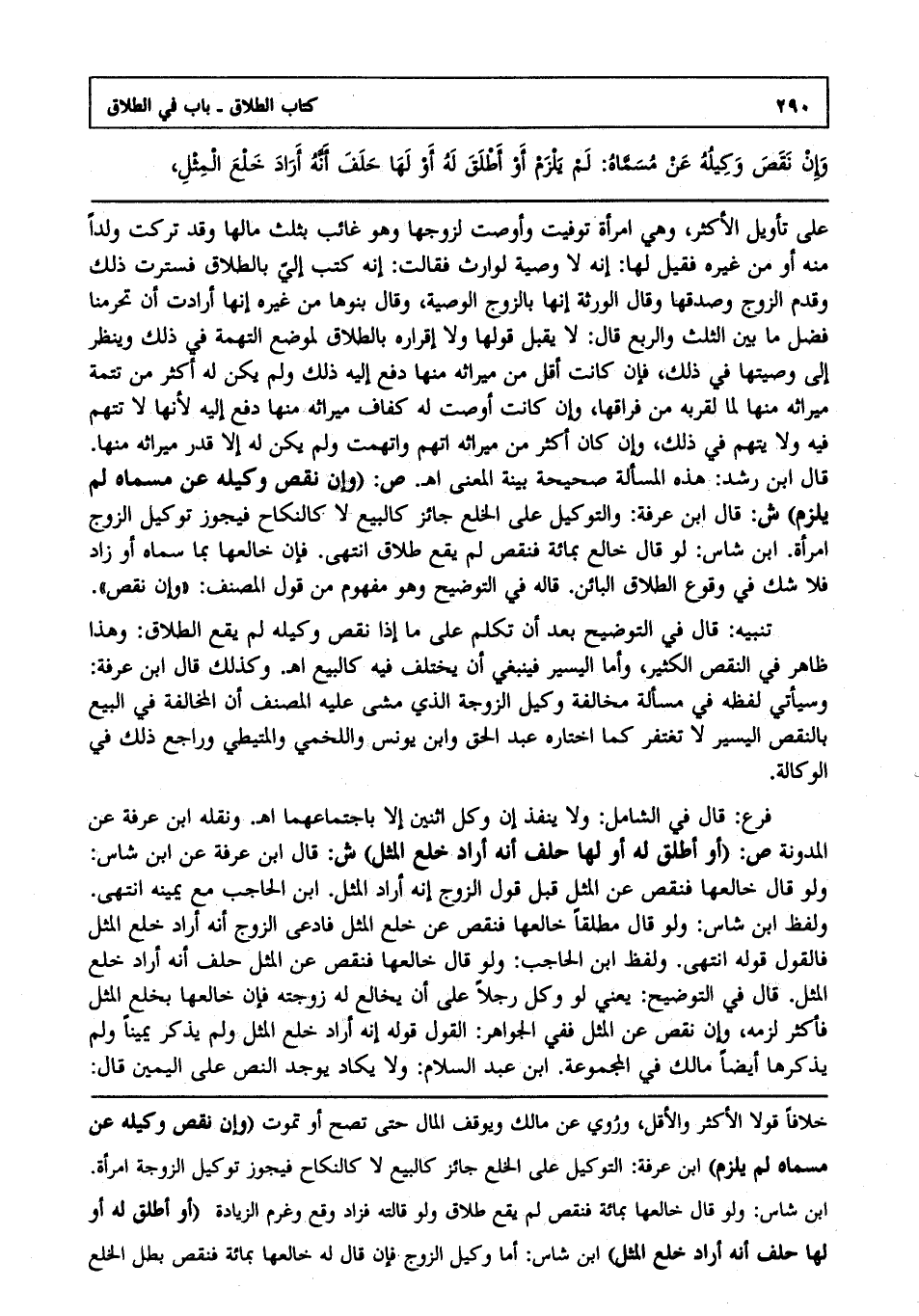 تنبيه: قال في التوضيح: بعد أن تكلم على ما إذا نقص وكيله لم يقع الطلاق وهذا ظاهر في النقص الكثير وأما اليسير فينبغي أن يختلف فيه كالبيع انتهى. وكذلك قال ابن عرفة: وسيأتي لفظه في مسألة مخالفة وكيل الزوجة الذي مشى عليه المصنف أن المخالفة في البيع بالنقص اليسير لا تغتفر كما اختاره عبد الحق وابن يونس واللخمي والمتيطي وراجع ذلك في الوكالة.