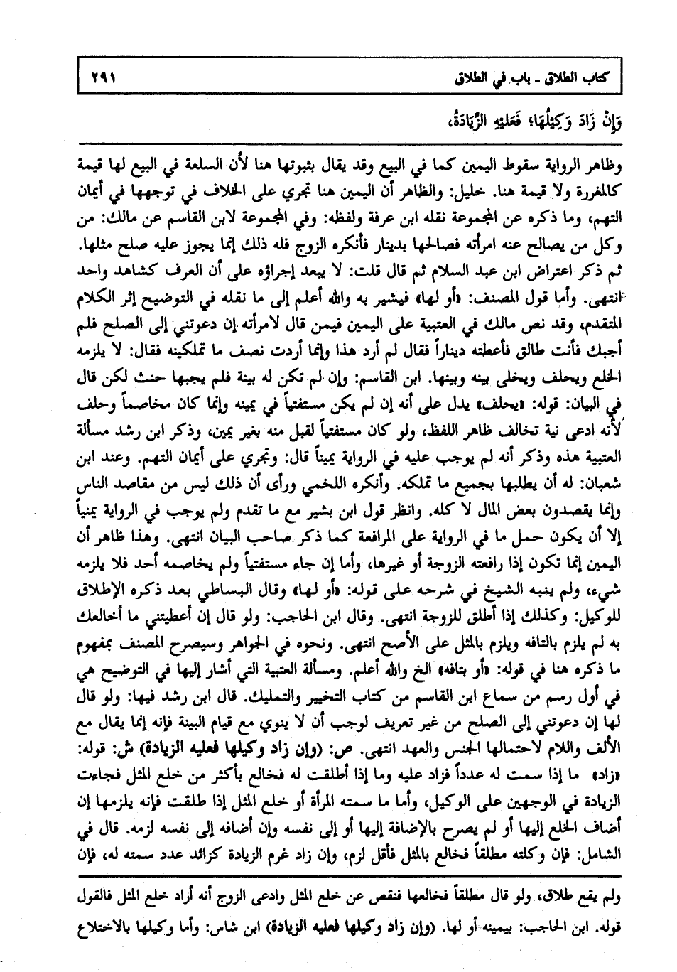 وظاهر الرواية سقوط اليمين كما في البيع وقد يقال بثبوتها هنا لأن السلعة في البيع لها قيمة كالمغررة ولا قيمة هنا خليل والظاهر أن اليمين هنا تجري على الخلاف في توجهها في أيمان التهم وما ذكره عن المجموعة نقله ابن عرفة ولفظه: وفي المجموعة لابن القاسم عن مالك: من وكل من يصالح عنه امرأته فصالحها بدينار فأنكره الزوج فله ذلك إنما يجوز عليه صلح مثلها ثم ذكر اعتراض ابن عبد السلام ثم قال: قلت: لا يبعد إجراؤه على أن العرف كشاهد واحد انتهى. وأما قول المصنف: "أو لها" فيشير به والله أعلم. إلى ما نقله في التوضيح إثر الكلام المتقدم وقد نص مالك في العتبية على اليمين فيمن قال: لامرأته إن دعوتني إلى الصلح فلم أجبك فأنت طالق فأعطته دينارا فقال لم أرد هذا وإنما أردت نصف ما تملكينه فقال لا يلزمه الخلع ويحلف ويخلى بينه وبينها ابن القاسم وإن لم تكن له بينة فلم يجبها حنث لكن قال: في البيان قوله: "يحلف" يدل على أنه إن لم يكن مستفتيا في يمينه وإنما كان مخاصما وحلف لأنه ادعى نية تخالف ظاهر اللفظ ولو كان مستفتيا لقبل منه بغير يمين وذكر ابن رشد مسألة العتبية هذه وذكر أنه لم يوجب عليه في الرواية يمينا قال: وتجري على أيمان التهم وعند ابن شعبان له أن يطلبها بجميع ما تملكه وأنكره اللخمي ورأى أن ذلك ليس من مقاصد الناس وإنما يقصدون بعض المال لا كله وانظر قول ابن بشير مع ما تقدم ولم يوجب في الرواية يمنيا إلا أن يكون حمل ما في الرواية على المرافعة كما ذكر صاحب البيان انتهى. وهذا ظاهر أن اليمين إنما تكون إذا رافعته الزوجة أو غيرها وأما إن جاء مستفتيا ولم يخاصمه أحد فلا يلزمه شيء ولم ينبه الشيخ في شرحه على قوله: "أو لها" وقال البساطي بعد ذكره الإطلاق للوكيل وكذلك إذا أطلق للزوجة انتهى. وقال ابن الحاجب ولو قال: إن أعطيتني ما أخالعك به لم يلزم بالتافه ويلزم بالمثل على الأصح انتهى. ونحوه في الجواهر وسيصرح المصنف بمفهوم ما ذكره هنا في قوله: "أو بتافه" الخ والله أعلم. ومسألة العتبية التي أشار إليها في التوضيح هي في أول رسم من سماع ابن القاسم من كتاب التخيير والتمليك قال ابن رشد: فيها ولو قال: لها إن دعوتني إلى الصلح من غير تعريف لوجب أن لا ينوي مع قيام البينة فإنه إنما يقال مع الألف واللام لاحتمالها الجنس والعهد انتهى. ص: "وإن زاد وكيلها فعليه الزيادة" ش: قوله زاد ما إذا سمت له عددا فزاد عليه وما إذا أطلقت له فخالع بأكثر من خلع المثل فجاءت الزيادة في الوجهين على الوكيل وأما ما سمته المرأة أو خلع المثل إذا طلقت فإنه يلزمها إن أضاف الخلع إليها أو لم يصرح بالإضافة إليها أو إلى نفسه وإن أضافه إلى نفسه لزمه قال: في الشامل فإن وكلته مطلقا فخالع بالمثل فأقل لزم وإن زاد غرم الزيادة كزائد عدد سمته له فإن