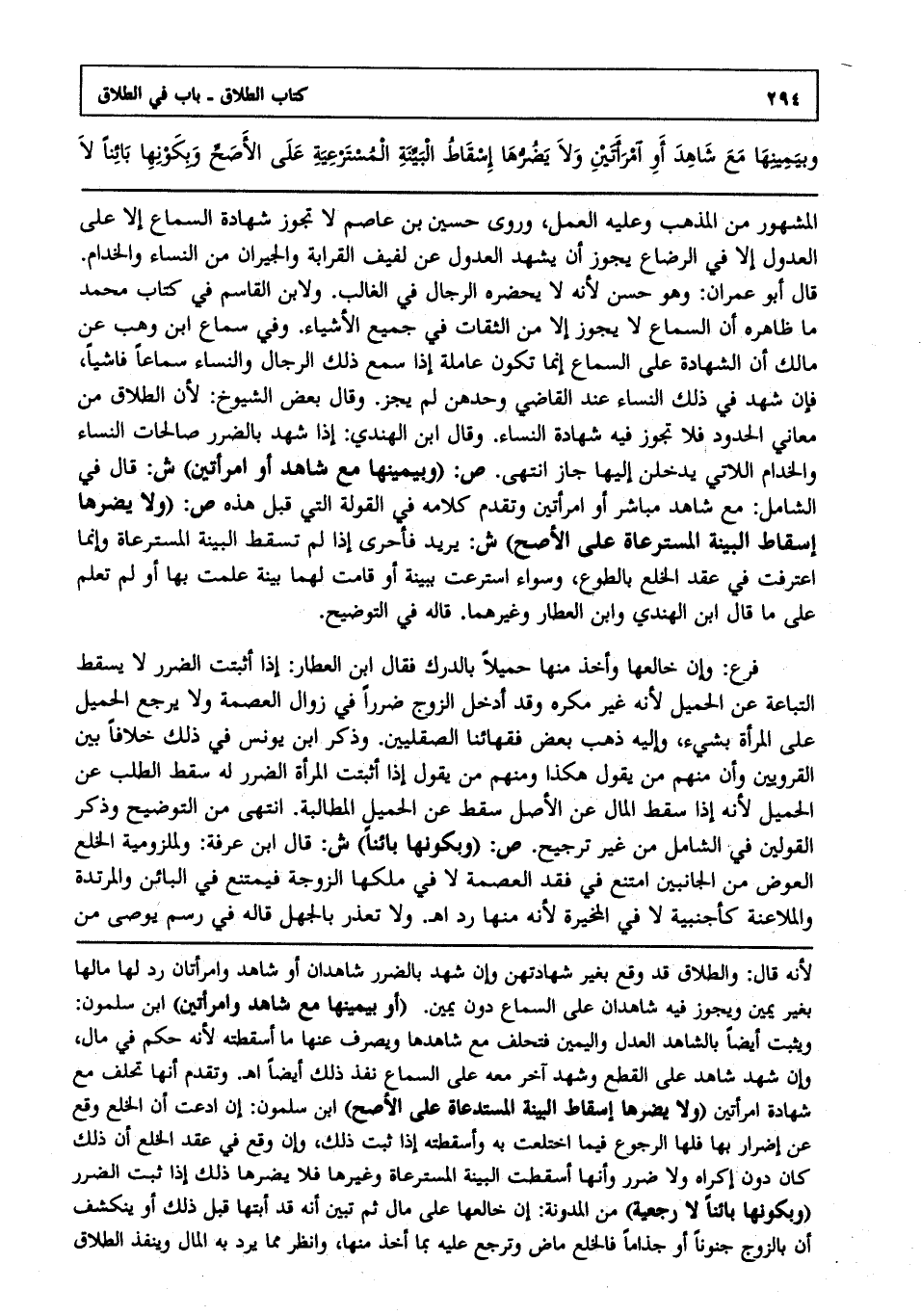 المشهور من المذهب وعليه العمل وروى حسين بن عاصم لا تجوز شهادة السماع إلا على العدول إلا في الرضاع يجوز أن يشهد العدول عن لفيف القرابة والجيران من النساء والخدام قال: أبو عمران وهو حسن لأنه لا يحضره الرجال في الغالب ولابن القاسم في كتاب محمد ما ظاهره أن السماع لا يجوز إلا من الثقات في جميع الأشياء وفي سماع ابن وهب عن مالك أن الشهادة على السماع إنما تكون عاملة إذا سمع ذلك الرجال والنساء سماعا فاشيا فإن شهد في ذلك النساء عند القاضي وحدهن لم يجز وقال بعض الشيوخ لأن الطلاق من معاني الحدود فلا تجوز فيه شهادة النساء وقال ابن الهندي إذا شهد بالضرر صالحات النساء والخدام اللاتي يدخلن إليها جاز انتهى. ص: "وبيمينها مع شاهد أو امرأتين" ش: قال: في الشامل مع شاهد مباشر أو امرأتين وتقدم كلامه في القولة التي قبل هذه ص: "ولا يضرها إسقاط البينة المسترعاة على الأصح" ش: يريد فأحرى إذا لم تسقط البينة المسترعاة وإنما اعترفت في عقد الخلع بالطوع وسواء استرعت ببينة أو قامت لهما بينة علمت بها أو لم تعلم على ما قال ابن الهندي وابن العطار وغيرهما قاله في التوضيح.