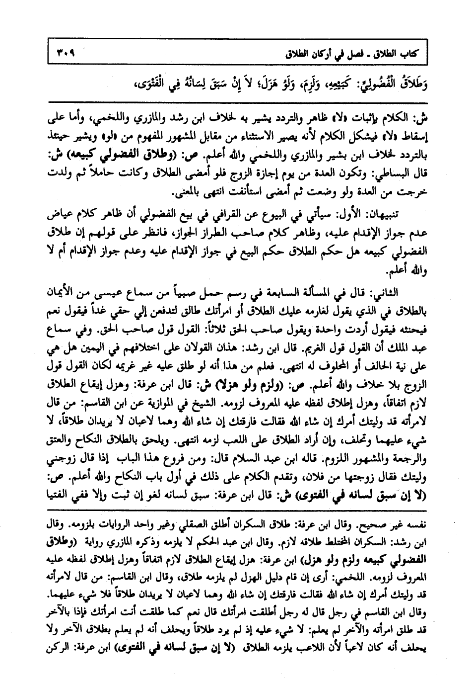 تنبيهان: الأول: سيأتي في البيوع عن القرافي في بيع الفضولي أن ظاهر كلام عياض عدم جواز الإقدام عليه وظاهر كلام صاحب الطراز الجواز فانظر على قولهم إن طلاق الفضولي كبيعه هل حكم الطلاق حكم البيع في جواز الإقدام عليه وعدم جواز الإقدام أم لا والله أعلم.